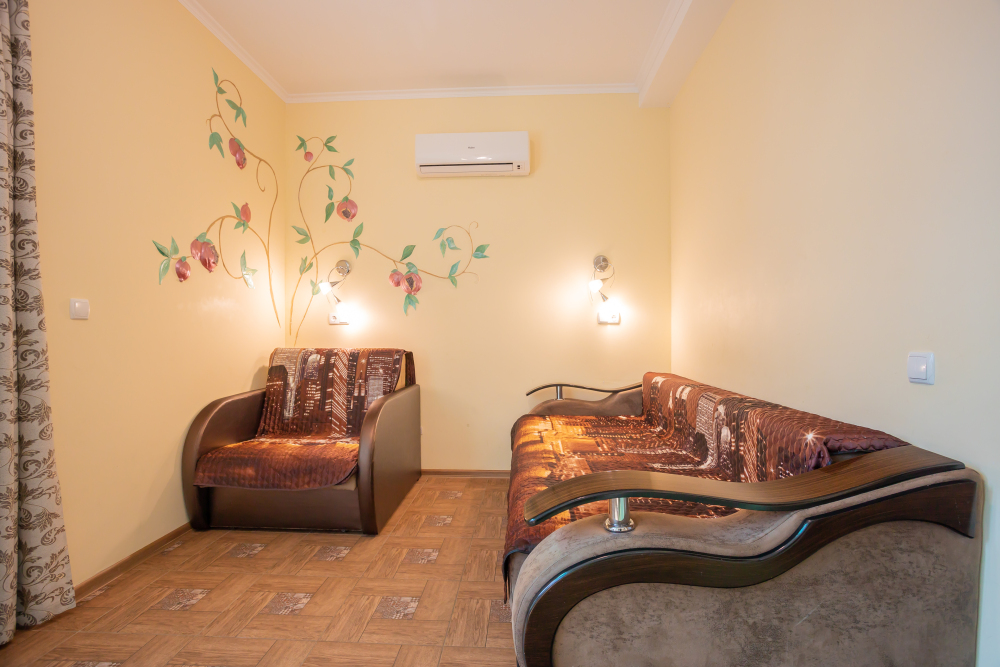 В комнате две односпальные или одна двуспальная кровати, кресло-кровать, шкафы, прикроватные тумбочки, стол, стулья, холодильник, фен, чайник, посуда, TV, интернет, кондиционер, балкон.