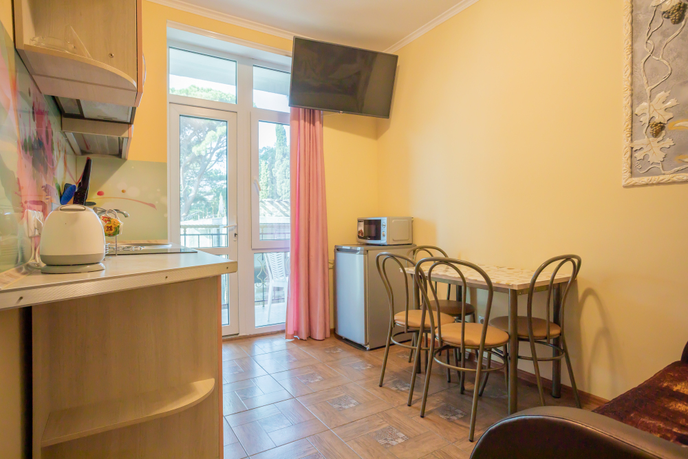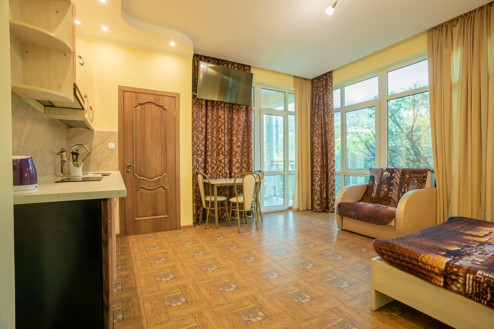 Две изолированные комнаты, в одной комнате две односпальные или одна двуспальная кровати, во второй комнате раскладной диван, шкафы, прикроватные тумбочки, стол, стулья, холодильник, чайник, посуда, фен, TV, интернет, в каждой комнате кондиционер, большой балкон, частичный вид на море или горы.