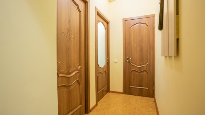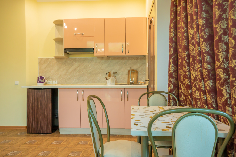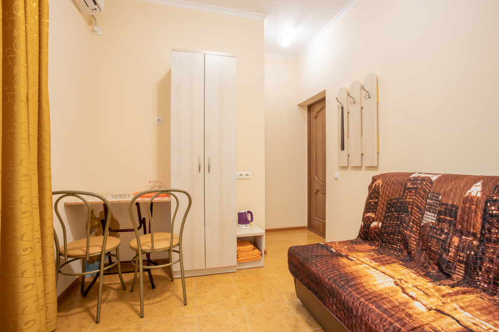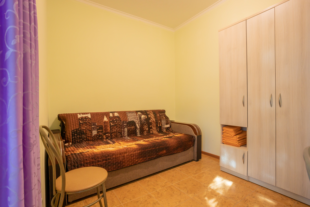 В комнате раскладной диван, шкафы, прикроватная тумбочка, стол, стулья, холодильник, фен, чайник, посуда, TV, интернет, кондиционер.