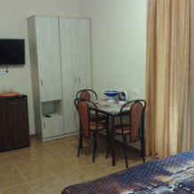 В комнате две односпальные или одна двуспальная кровати, кресло-кровать, шкафы, прикроватные тумбочки, стол, стулья, холодильник, фен, чайник, посуда, TV, интернет, кондиционер, большой балкон, частичный вид на море.