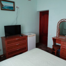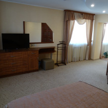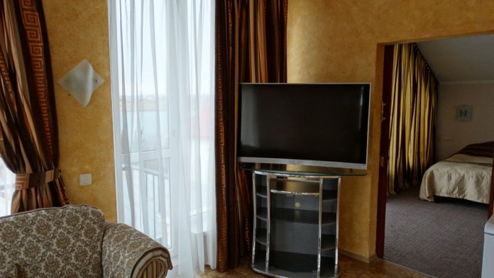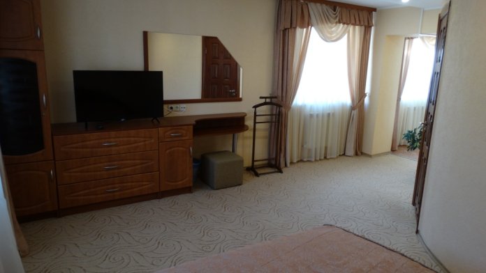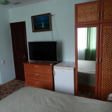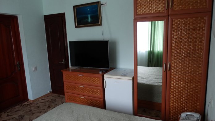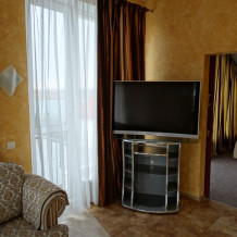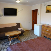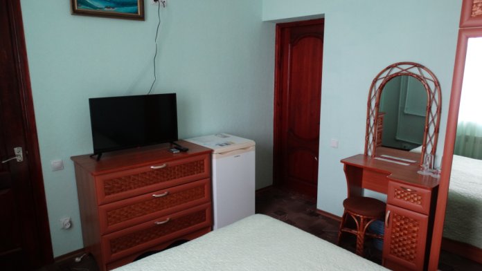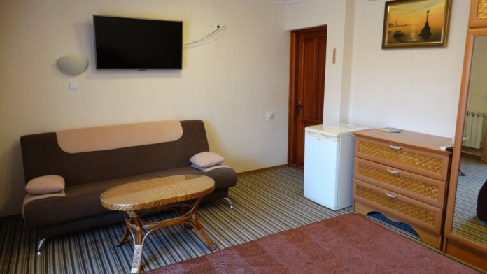 Двухкомнатный номер. В гостиной расположен большой зеркальный шкаф-купе, раскладной мягкий уголок, холодильник, журнальный столик. Из спальни можно выйти на балкон с видом на море. Здесь стоит большая двуспальная кровать, есть комод, шкаф, консольный столик с зеркалом, телевизор. Санузел с угловой ванной.