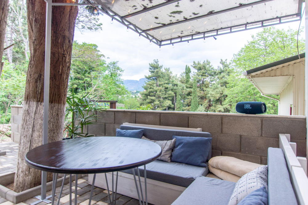 В вашем распоряжении собственный закрытый дворик с атмосферной подсветкой в вечернее время и изолированной зоной отдыха, бесплатный двухдиапазонный Wi-Fi. Вид со двора на парковую зону и гору Демер-Джи.
