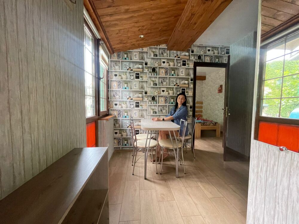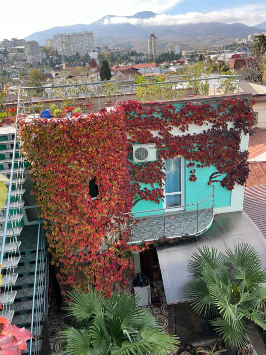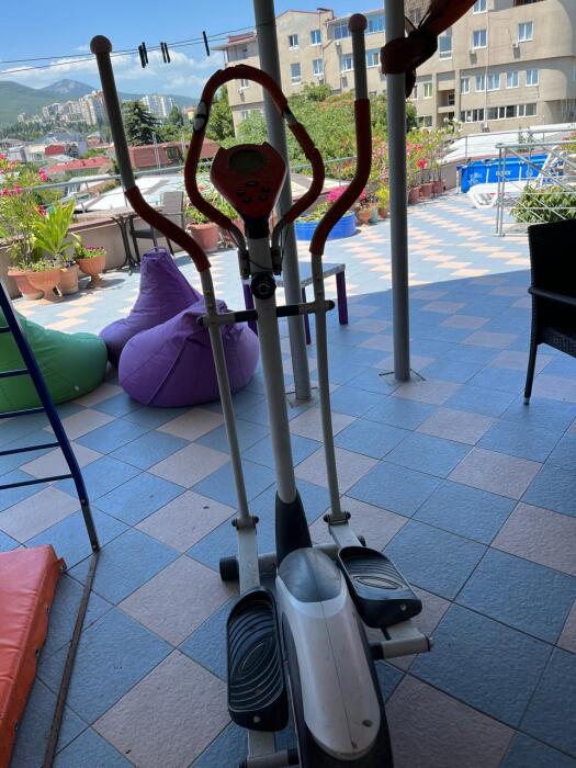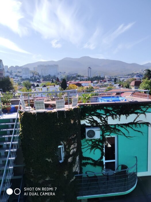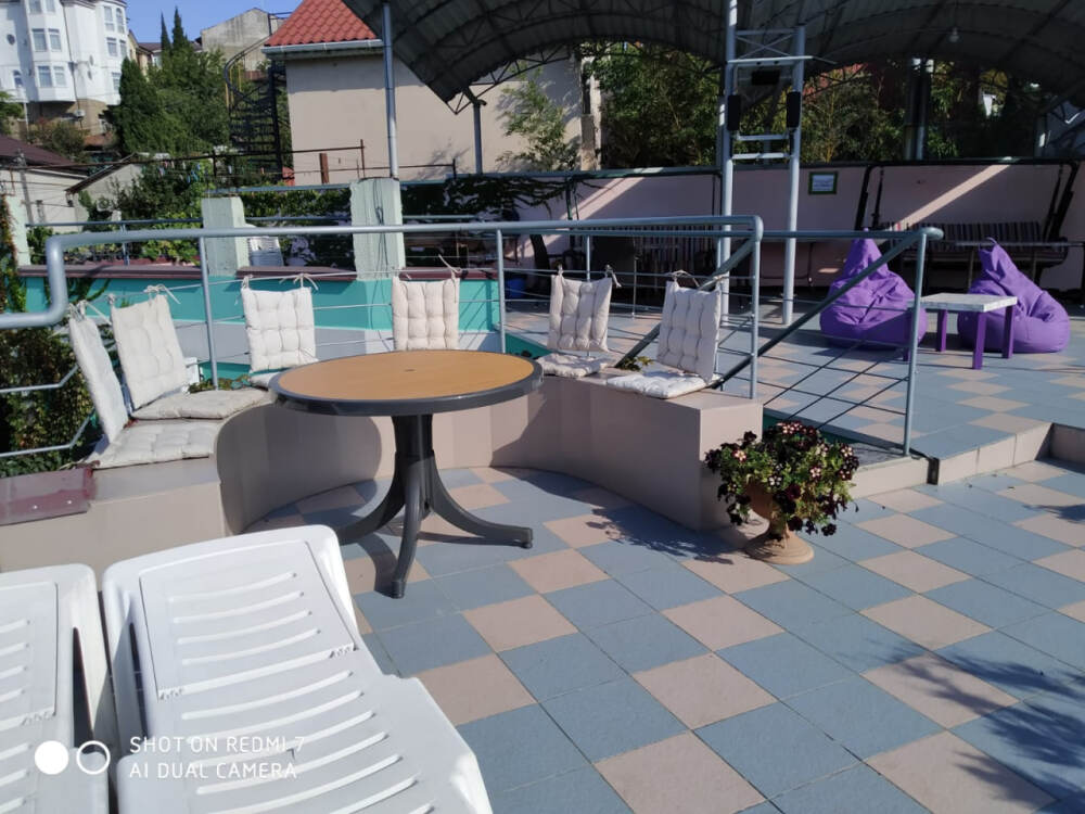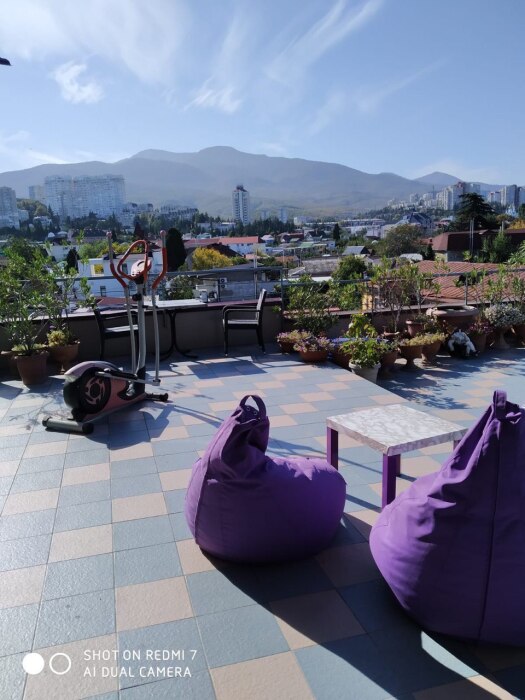 На видовой террасе площадью 150 кв.м. спортивный тренажер, мангал, столики, стулья, шезлонги, лежаки для загара,2 качели . Зеленый патио-дворик порадует плодоносящими бананами, киви, хурмой, виноградом, бамбуком, юкками, агавами и цветами. Уютные беседки, «Кофейный» и «Пивной» уголок, мангал .