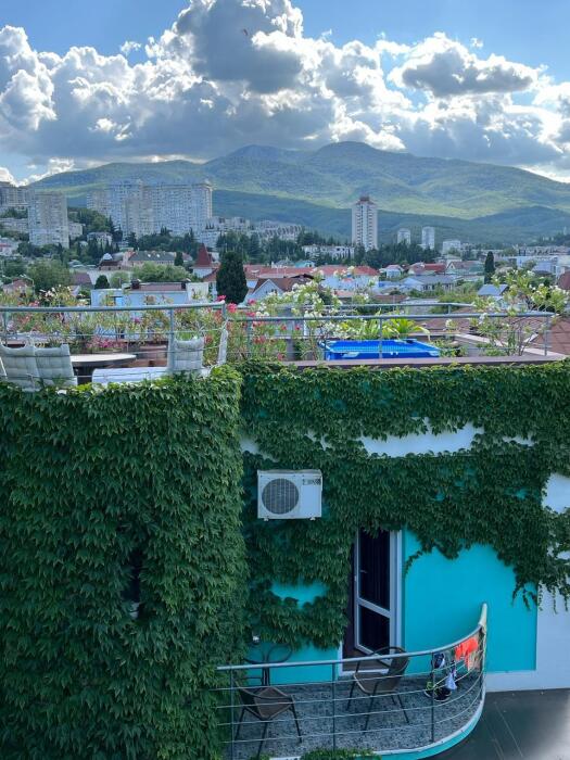 Новый просторный номер эксклюзивного дизайна с дизайнерской мебелью. Балкон - терраса и окно в номере с великолепным видом на горы ЧатырДаг и Крымскую Яйлу. В номере двухспальный диван и две деревянные кровати. Номер перегораживается плотной шторой на два помещения. Имеет личную оборудованную кухню и санузел с душем, кондиционер, шкаф. Горячая и холодная вода круглосуточно. Wi-Fi бесплатно.