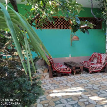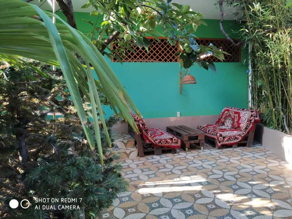 Небольшой прохладный номер на первом этаже с собственной кухней под навесом и личной беседкой. В номере две кровати, одноместный диванчик, шкаф, телевизор, кондиционер, фен, сейф , санузел с душем.
