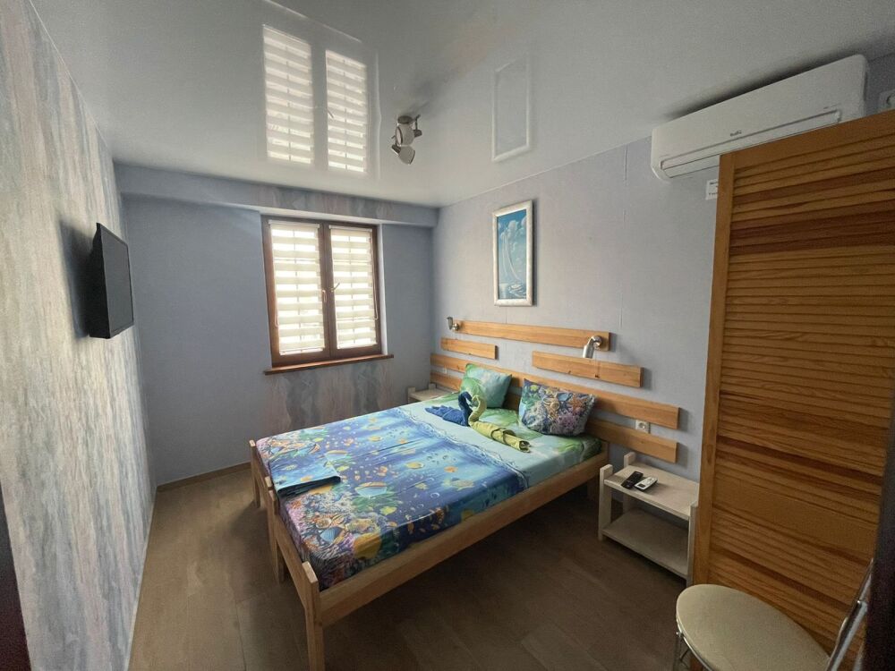 Комната эксклюзивного дизайна с дизайнерской мебелью. Кровать-яхта с ортопедическим матрасом. Шкаф с иллюминаторами. Панорамное окно с шикарным видом на горы. Кондиционер. Санузел с душем. Телевизор ЖК. Ниша с полочками выложена натуральными морскими камнями и рапанами. Потолок - натуральное дерево с мачтами балками.