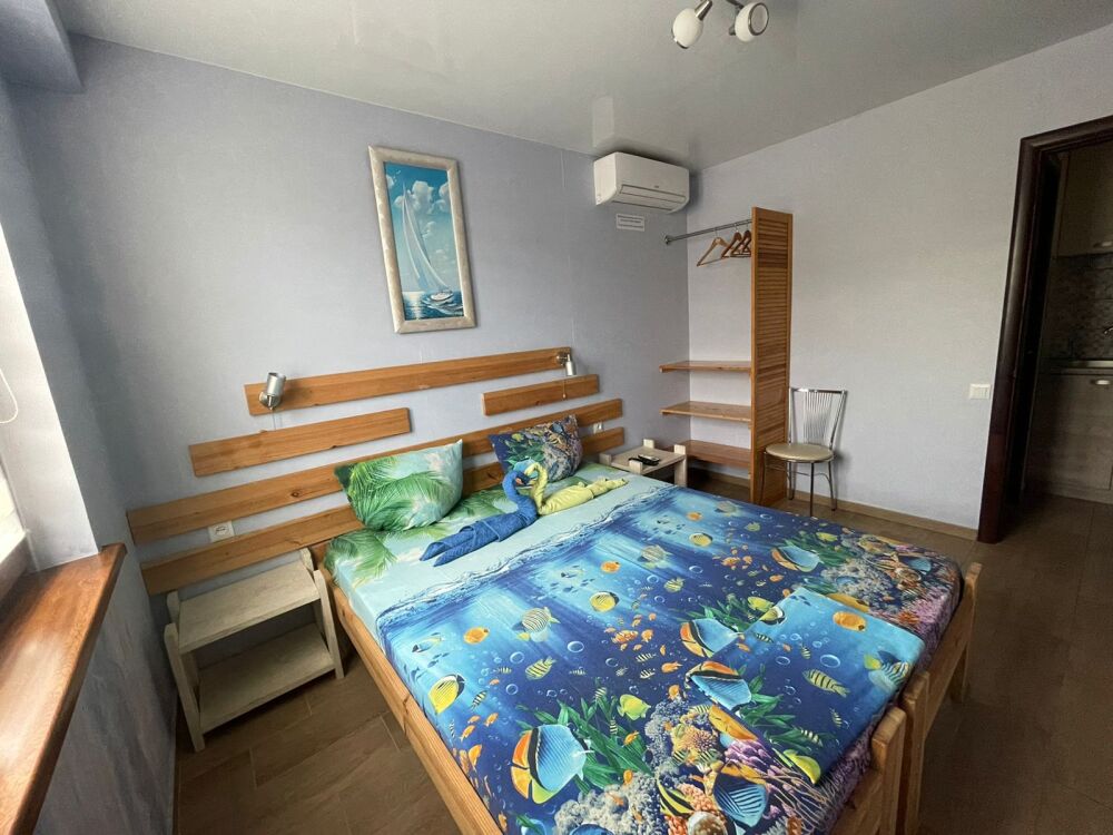 Новейший двухкомнатный номер с эксклюзивным дизайном. Комнаты изолированные, личная оборудованная кухня, санузел с душем, балкон со столом и стульями в зелени. Правая спальня - двухспальная кровать, тумбочки, шкаф, телевизор, кондиционер. Левая спальня -две кровати , тумбочка, шкаф, телевизор, кондиционер, камод. Имеется цифровой сейф и фен. Номер тихий, уединённый, не имеет соседей за стенами.