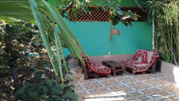 Номер имеет дворик с двумя диванчиками , столиком и мангалом.