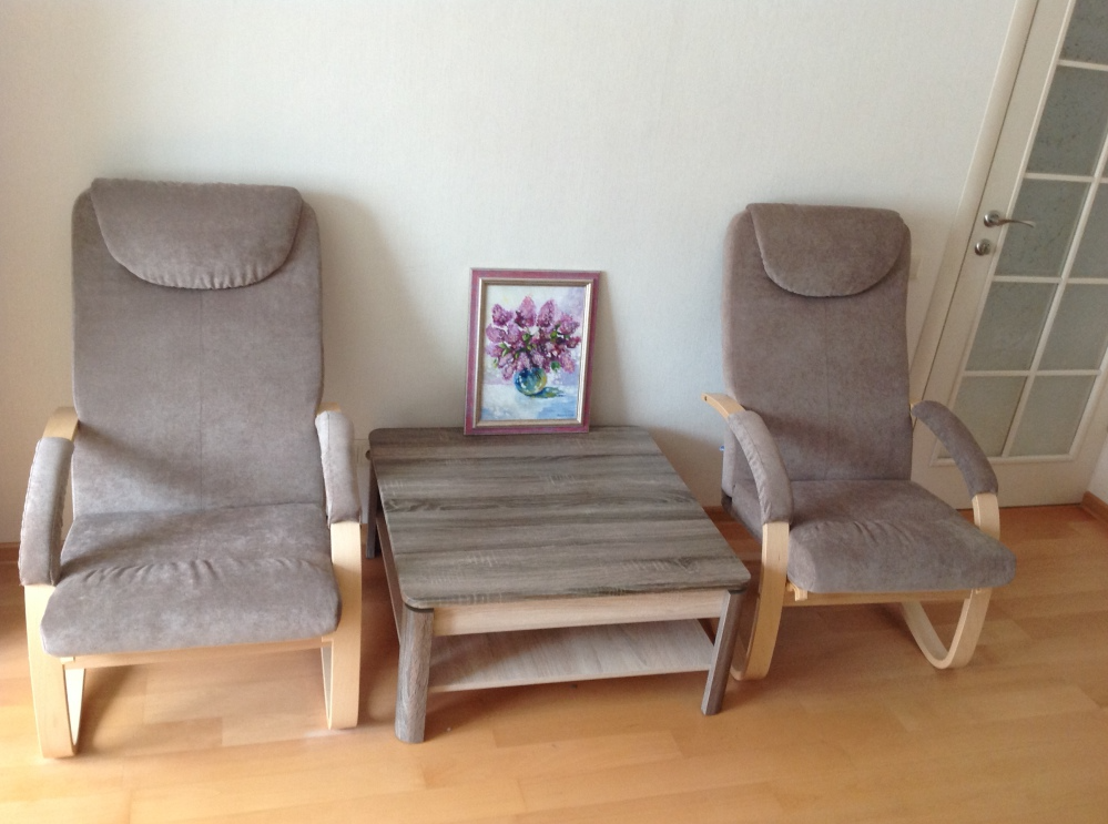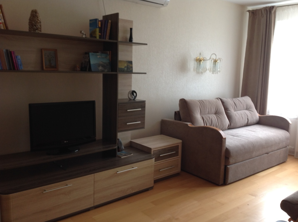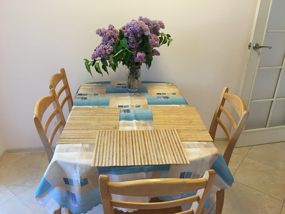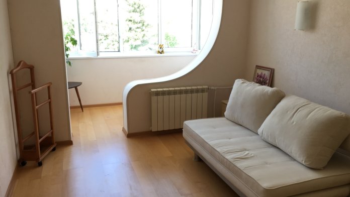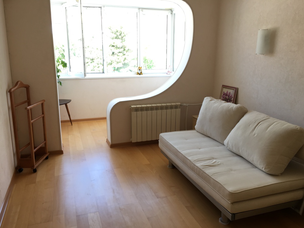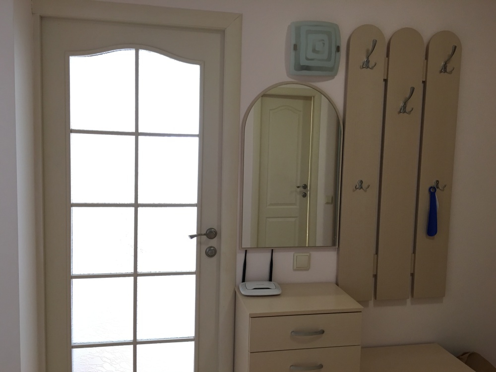 Уютная, светлая двухкомнатная квартира в центре поселка с видом на горы (церковь), площадь платанов и море.