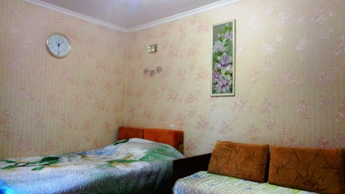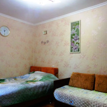 В комнате: двуспальная кровать, односпальная кровать , возможно установить четвертое спальное место в виде раскладушки, шкаф-гардероб, гладильная доска.
