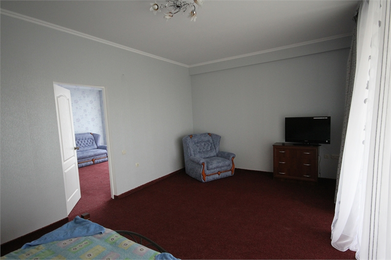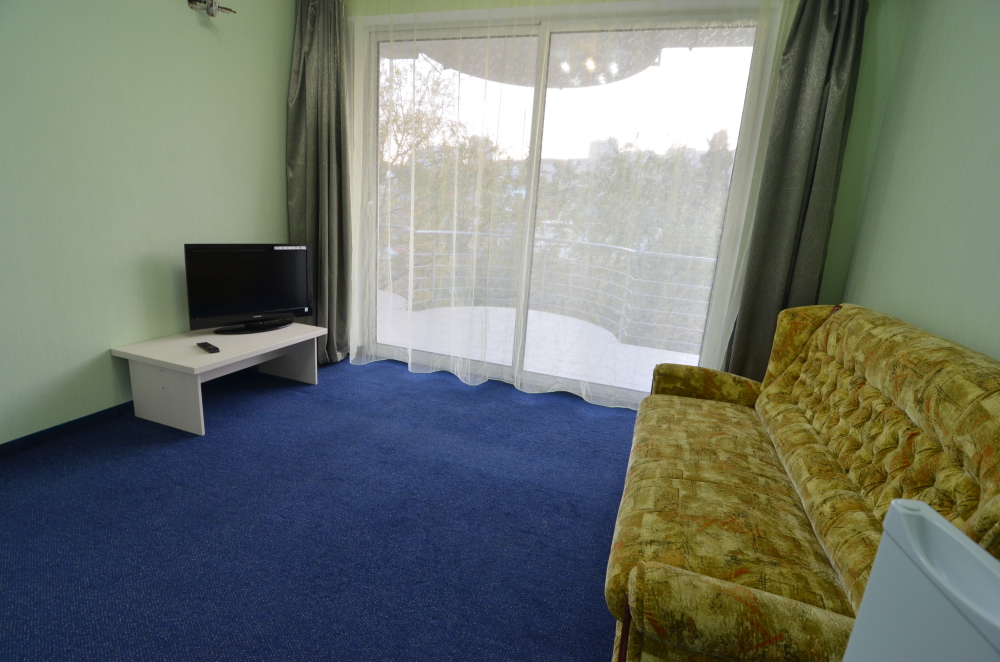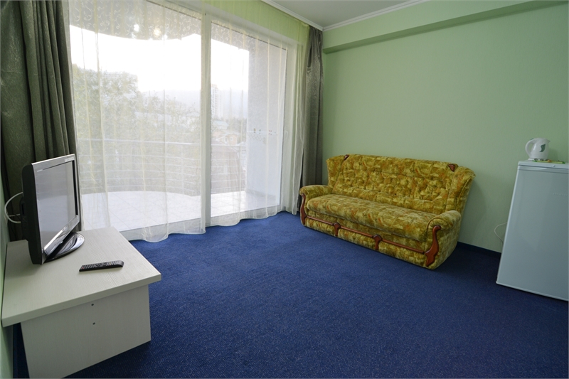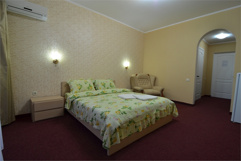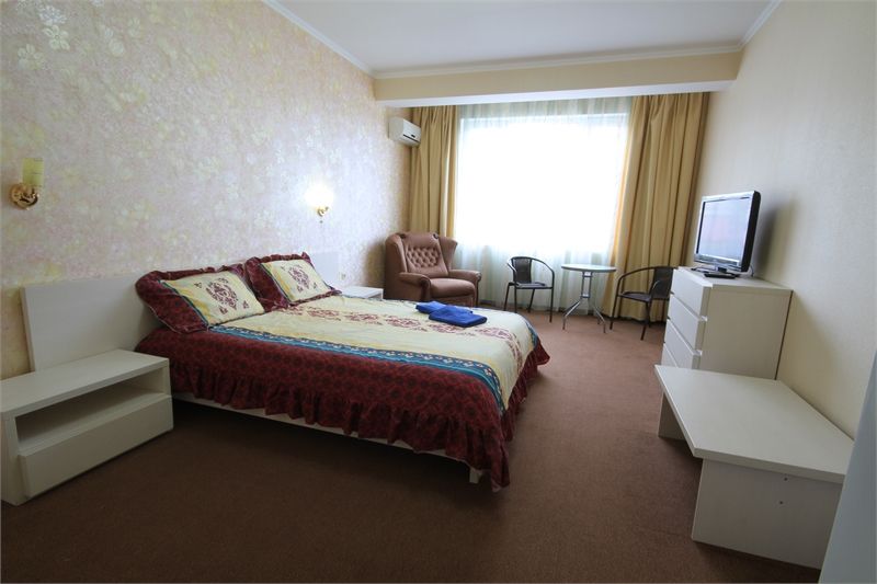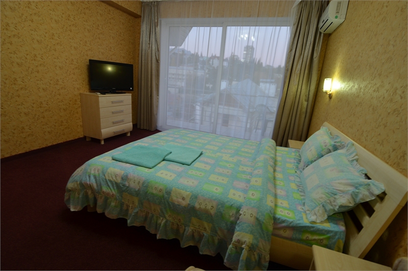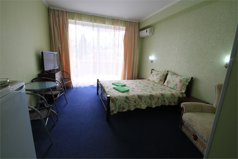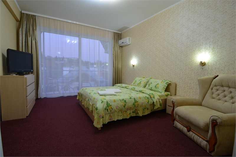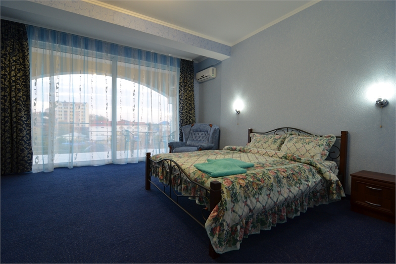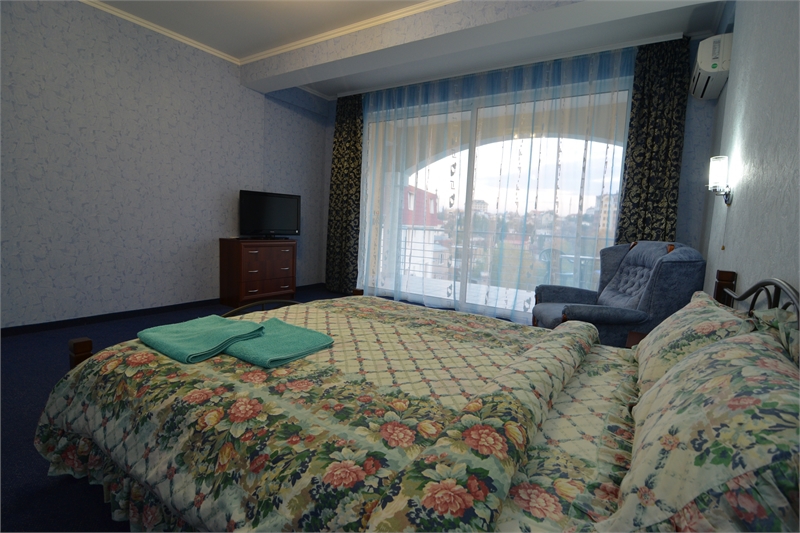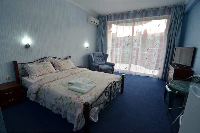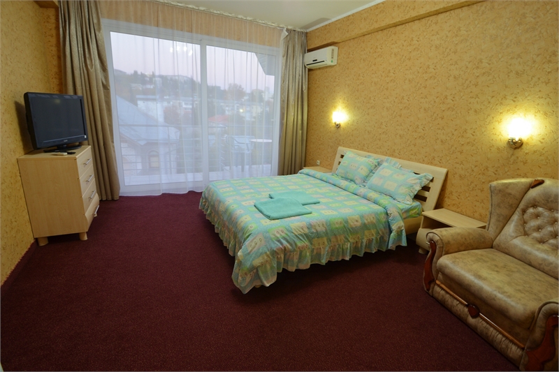 В комнате двуспальная кровать, односпальное кресло, санузел, кондиционер, телевизор, сейф, фен, холодильник, балкон.