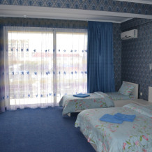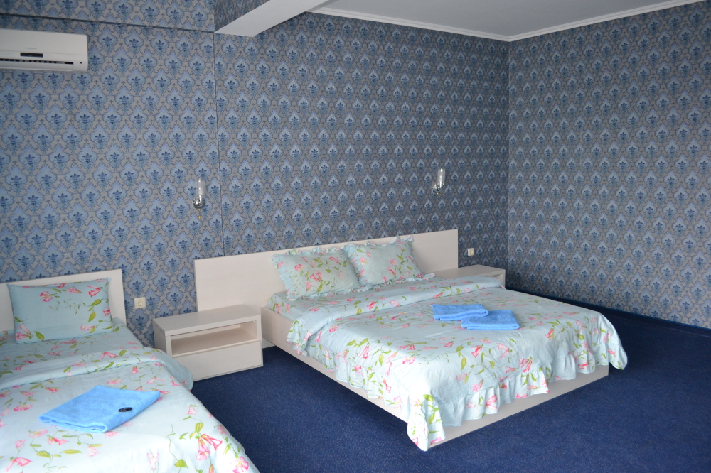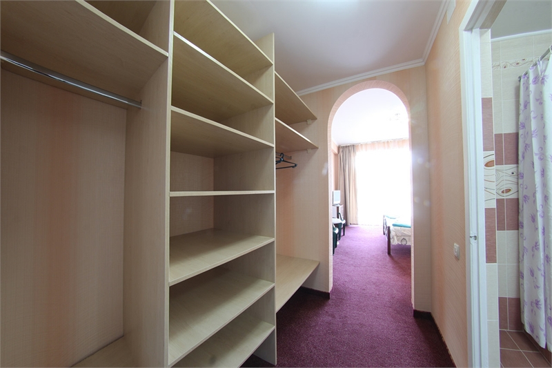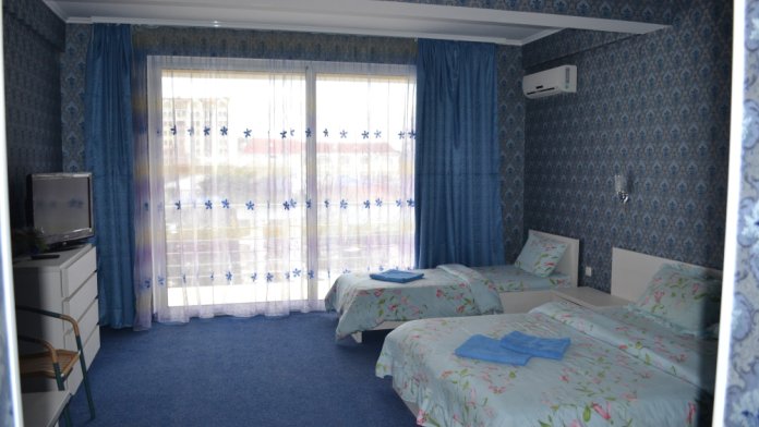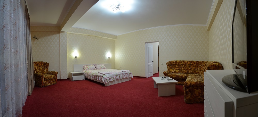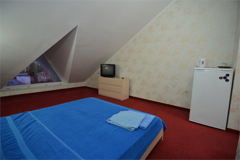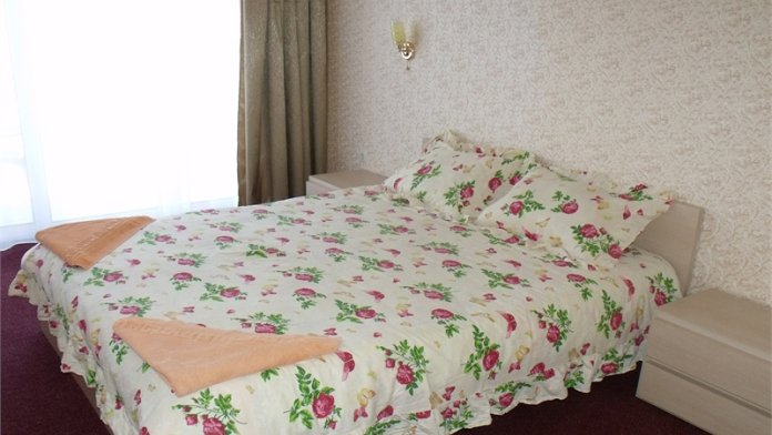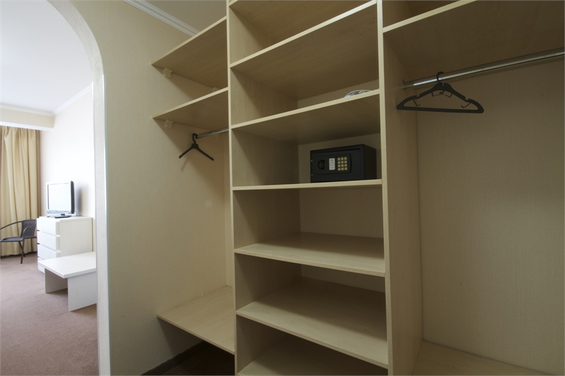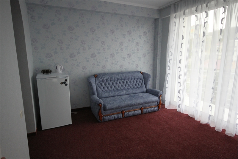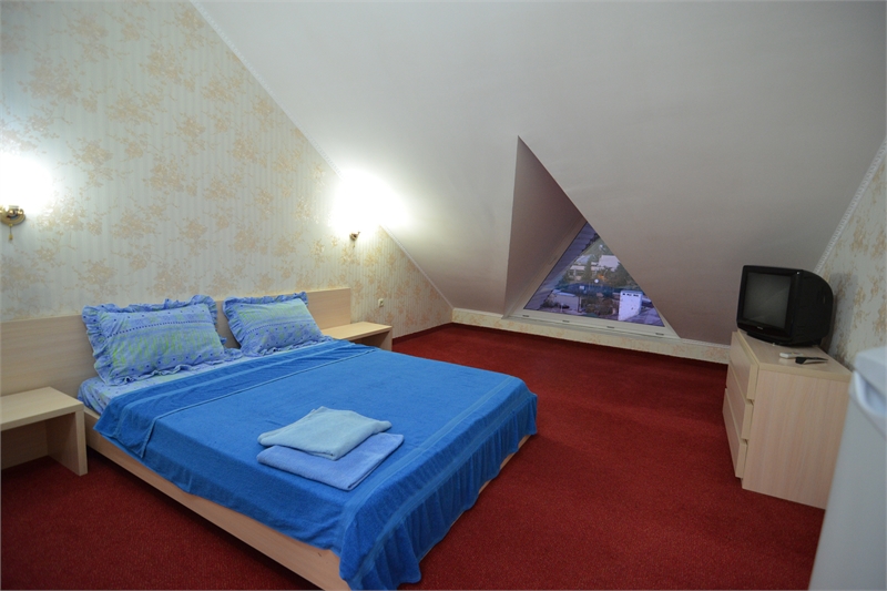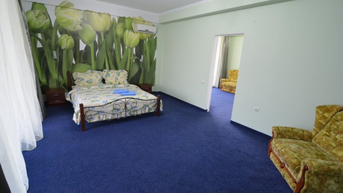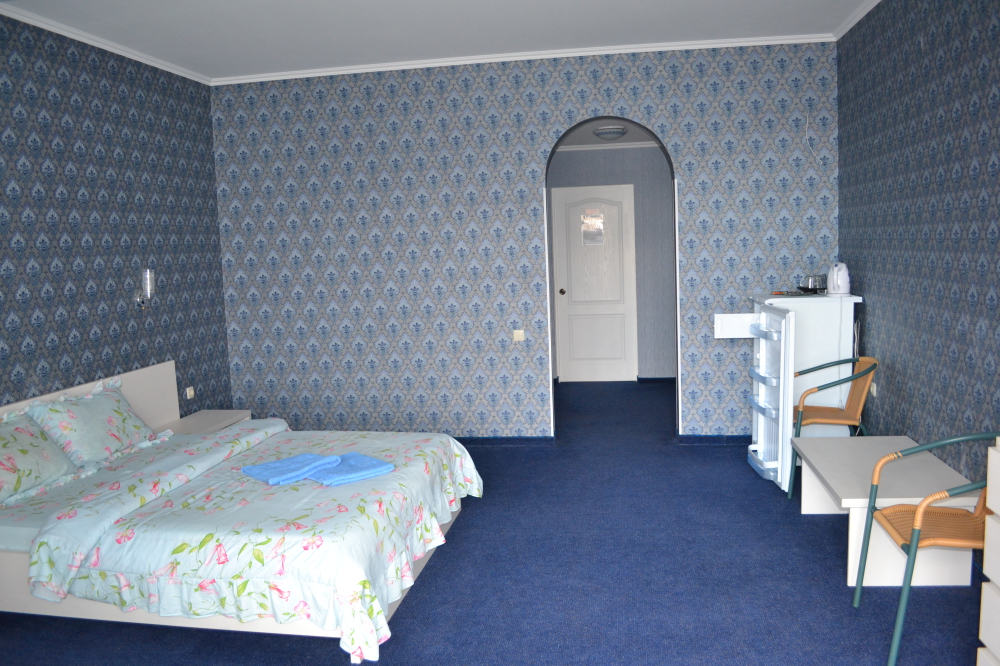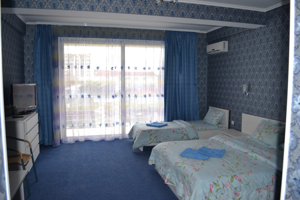 В комнате двуспальная кровать, односпальное кресло, санузел, кондиционер, телевизор, сейф, фен, холодильник, балкон.