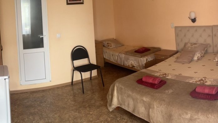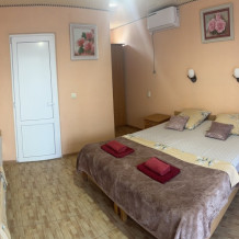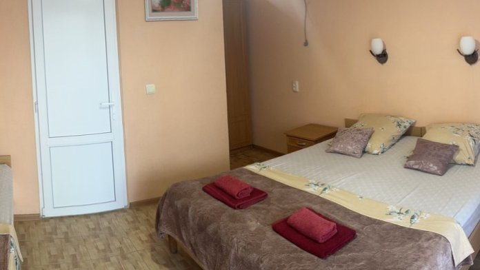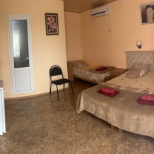 В номере находится двуспальная и односпальная кровати,тумбочки,бра над кроватью, шкаф для одежды, шкаф с посудой для вашего личного пользования(тарелки,стопки,бокалы,кастрюля, доска,нож,ложки,вилки,салатница), журнальный столик, два стула,сушилка для белья. Возле номера балкон с летней мебелью,где вы сможете отдыхать в тени крымского винограда.