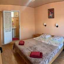 В номере находится двуспальная кровать,тумбочки,бра над кроватью, шкаф для одежды, шкаф с посудой для вашего личного пользования(тарелки,стопки,бокалы,кастрюля, доска,нож,ложки,вилки,салатница), журнальный столик, два стула,сушилка для белья. Возле номера балкон с летней мебелью,где вы сможете отдыхать в тени крымского винограда.