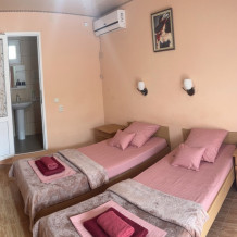 В номере находится две односпальные кровати,тумбочки,бра над кроватью, шкаф для одежды, шкаф с посудой для вашего личного пользования(тарелки,стопки,бокалы,кастрюля, доска,нож,ложки,вилки,салатница), журнальный столик, два стула,сушилка для белья. Возле номера балкон с летней мебелью,где вы сможете отдыхать в тени крымского винограда.