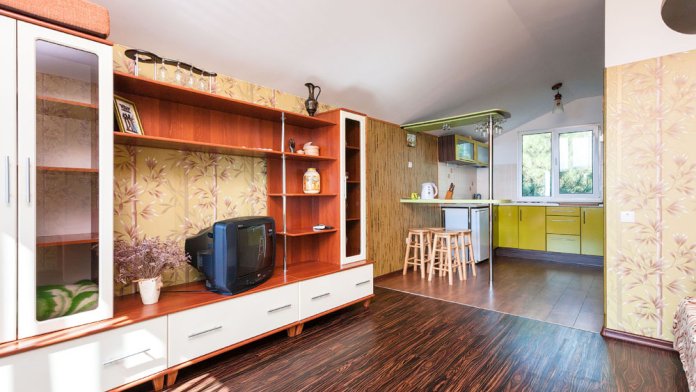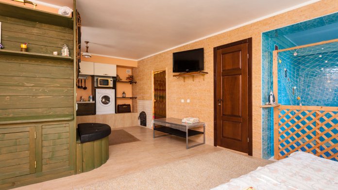 Номера для семьи 2-4 человека. два раскладных дивана, укомплектованная кухня, микроволновая печь,стиральная машинка-автомат. гладильная доска, телевизор. холодильник, сан.узел. постоянно холодная и горячая вода, интернет.