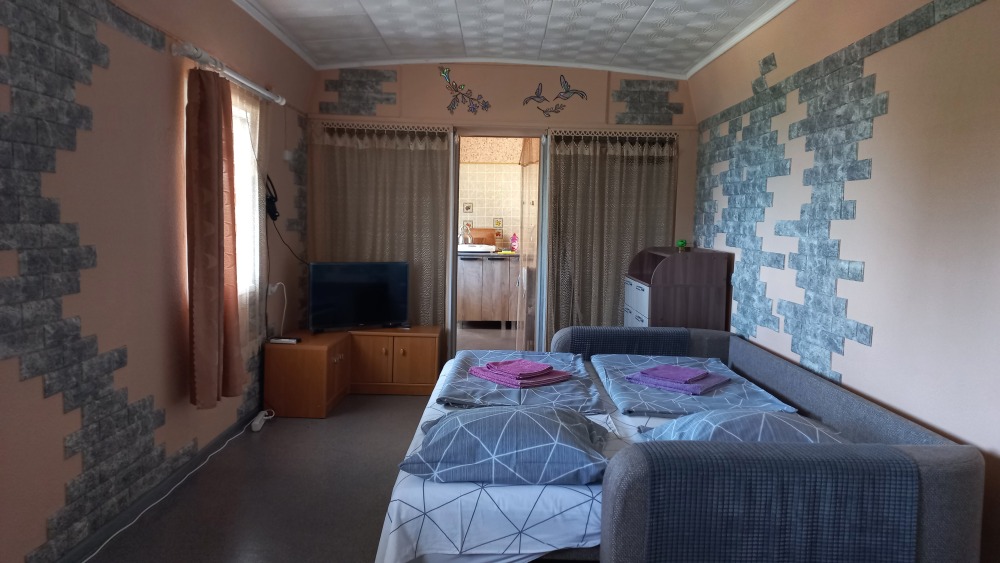 В доме большой балкон, просторная комната, полностью оборудованная и укомплектованная кухня (моющее средство, губки, кухонное полотенце, мусорные пакеты), санузел (банные полотенца, мыло, туалетная бумага, душ, холодильник. Круглосуточно холодная и горячая вода, телевизор с кабельным подключением, Wi-Fi. Из окон открывается шикарный вид на залив и горы, на террасе место для отдыха на открытом воздухе.