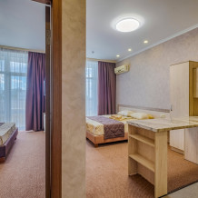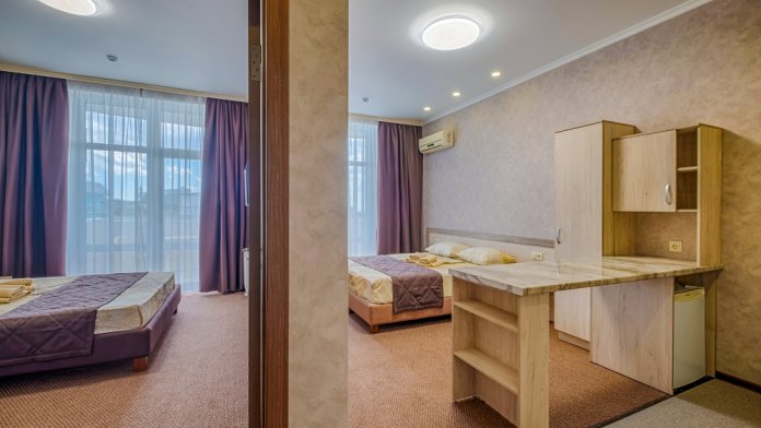 Двухкомнатный четырехместный Семейный номер состоит из 2 комнат оборудованных двуспальными кроватями, с общим балконом. В каждой комнате телевизор и кондиционер. Возможно размещение на дополнительном месте (кресло-кровать). Номера находятся на 1 и 2 этаже, оборудованы сейфами и электронными замками.