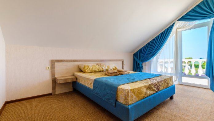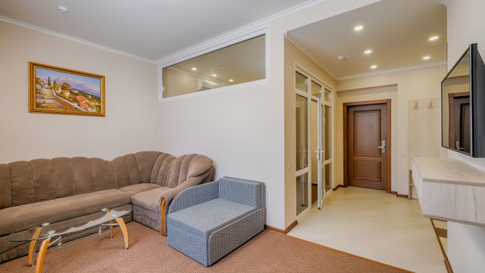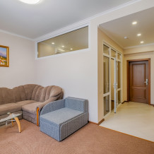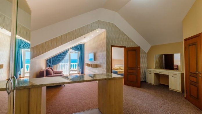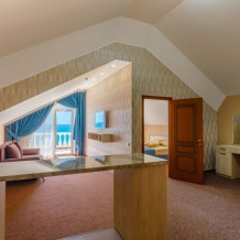Двухкомнатный трехместный номер Делюкс расположен на 4 мансардном этаже гостиницы. Комфортный, просторный, светлый номер. Номера имеют боковой вид на море, большой меблированный балкон. Номера оснащены сейфами, имеют электронные замки.