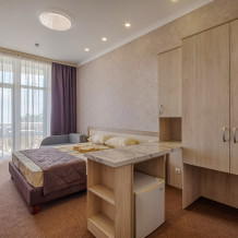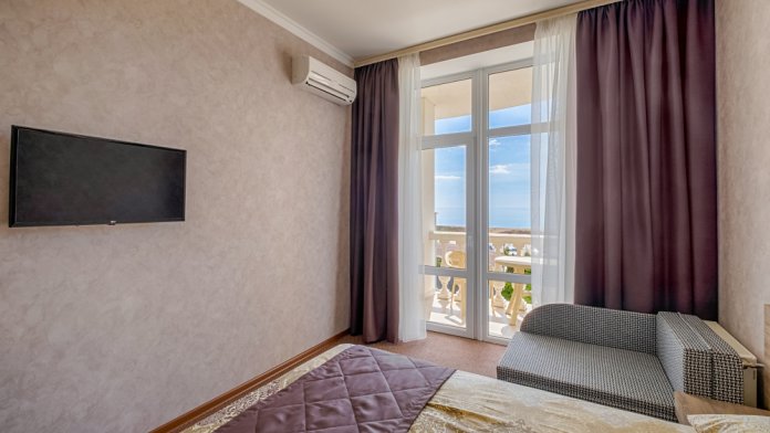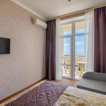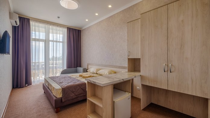 Комфортабельный Стандартный однокомнатный двухместный номер улучшенной планировки. Номер с балконом расположен на 3 этаже здания с видом на город и частично на море. В номере двуспальная кровать и кресло-кровать.
