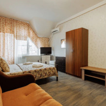 Номер оснащен двуспальной кроватью и мягким диваном, которые обеспечат Вам отличный сон и отдых после активного дня. Также в номере предусмотрены кондиционер, холодильник, ЖК-телевизор