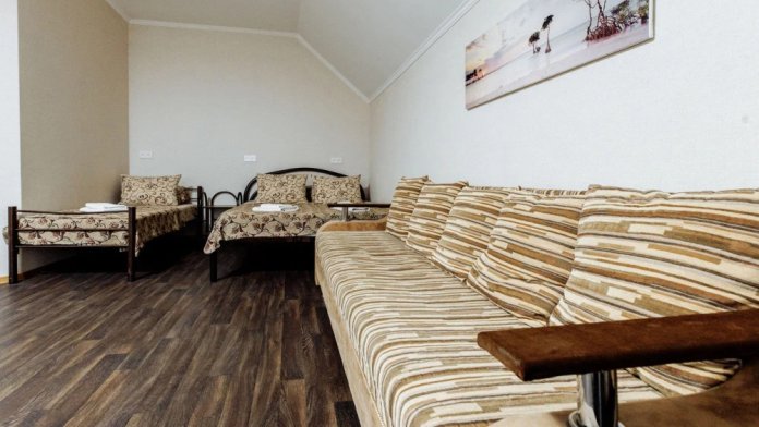 Номер оснащен двуспальной кроватью, двумя односпальными кроватями и мягким двухместным диваном, которые обеспечат Вам отличный сон и отдых после активного дня. Также в номере предусмотрены кондиционер, холодильник, ЖК-телевизор.