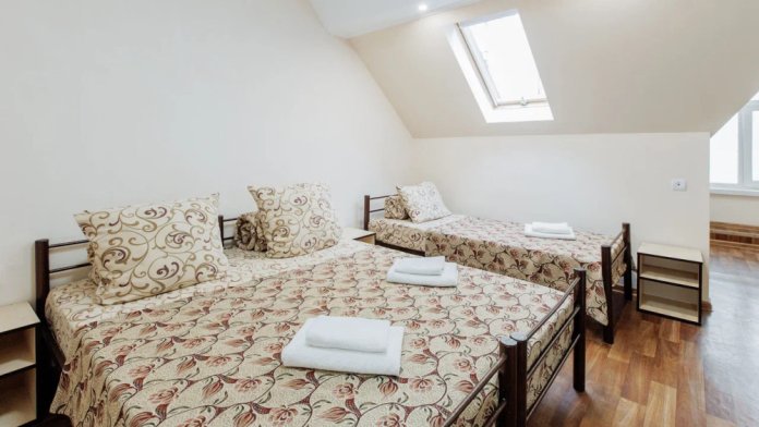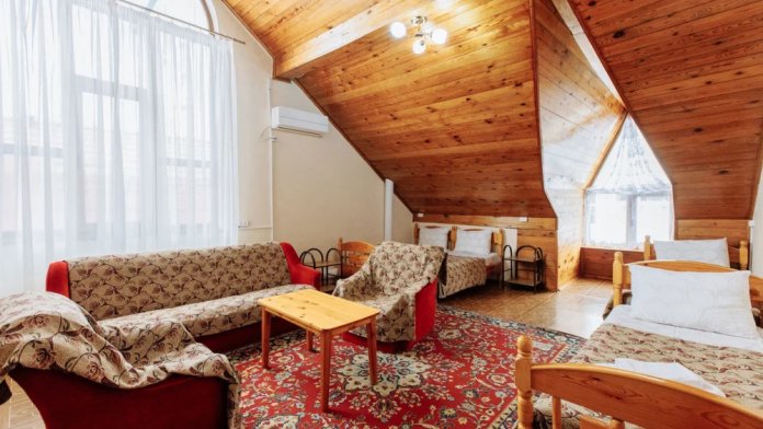 Однокомнатный просторный номер для комфортного пребывания больших семей или компаний. Общий просторный санузел на этаже оборудован ванной