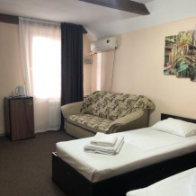 В номере: 2 односпальные кровати, 1 двуспальная кровать, 1 диван односпальный.
