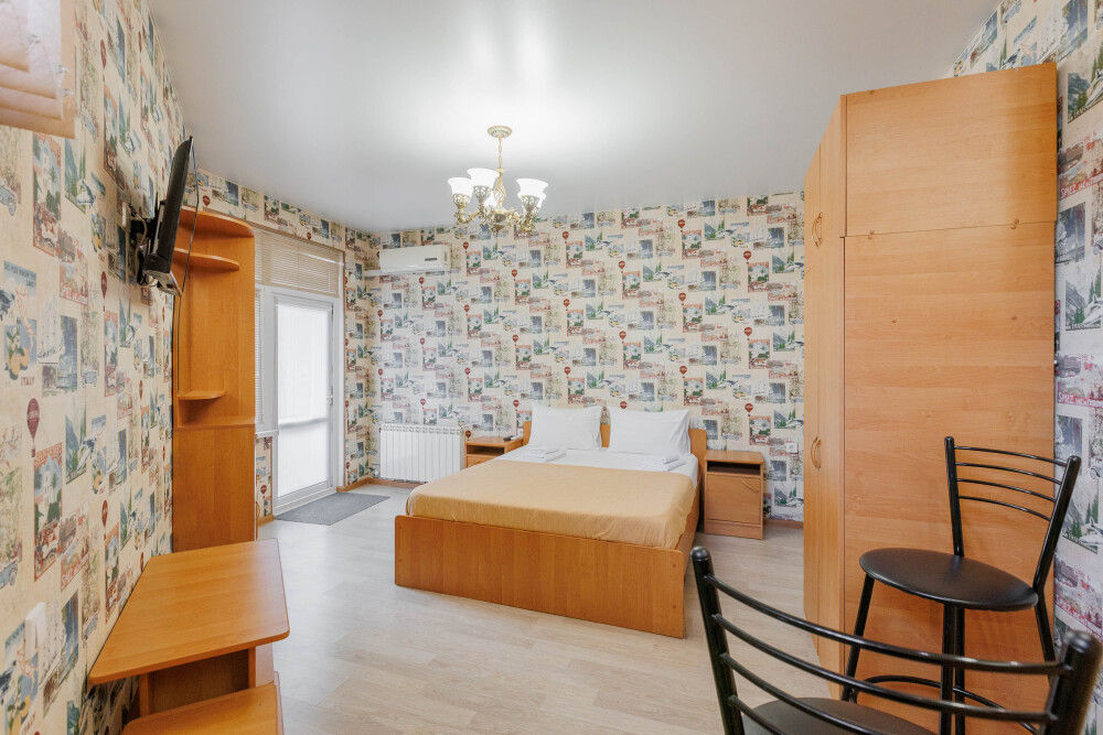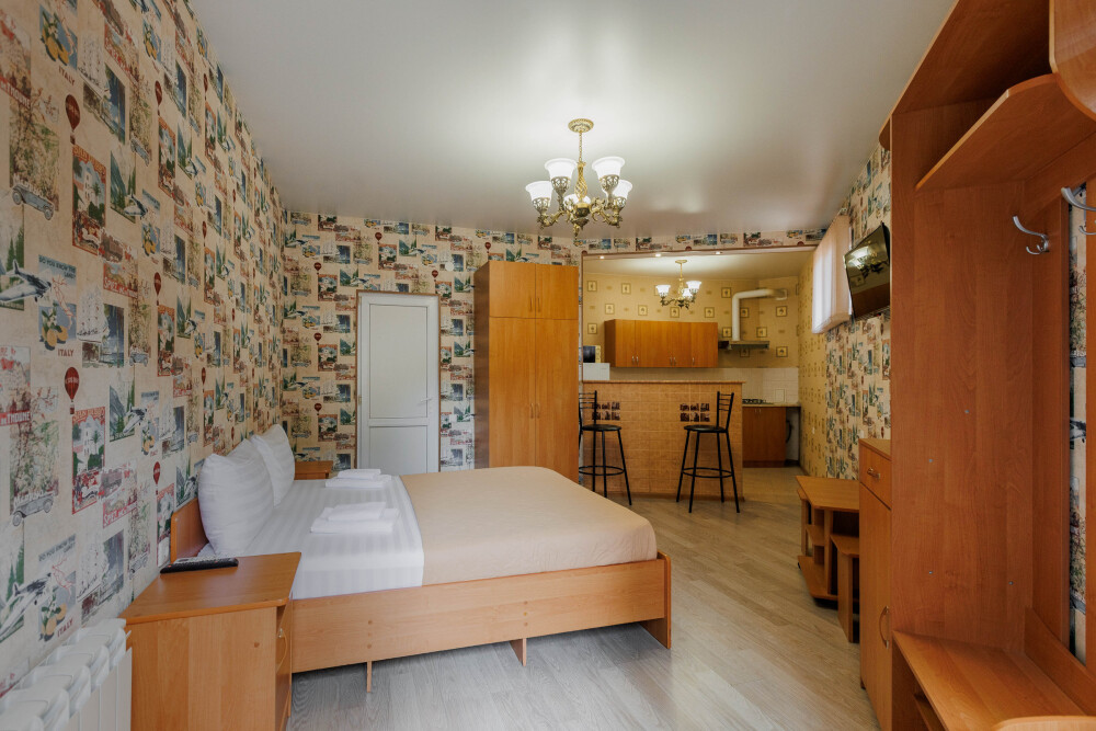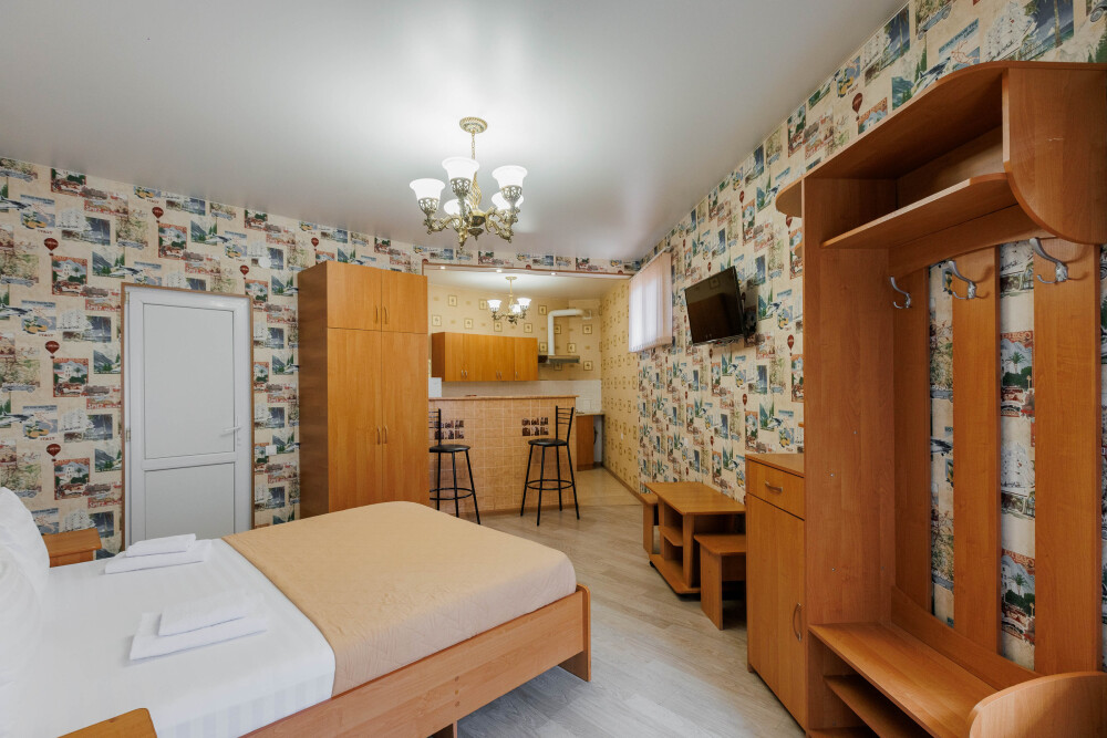 Мягкая двуспальная кровать. Собственная кухонная зона, кондиционер, холодильник, ЖК телевизор и санузел с душем обеспечат ваше удобство. В номере есть журнальный столик и шкаф-купе.
