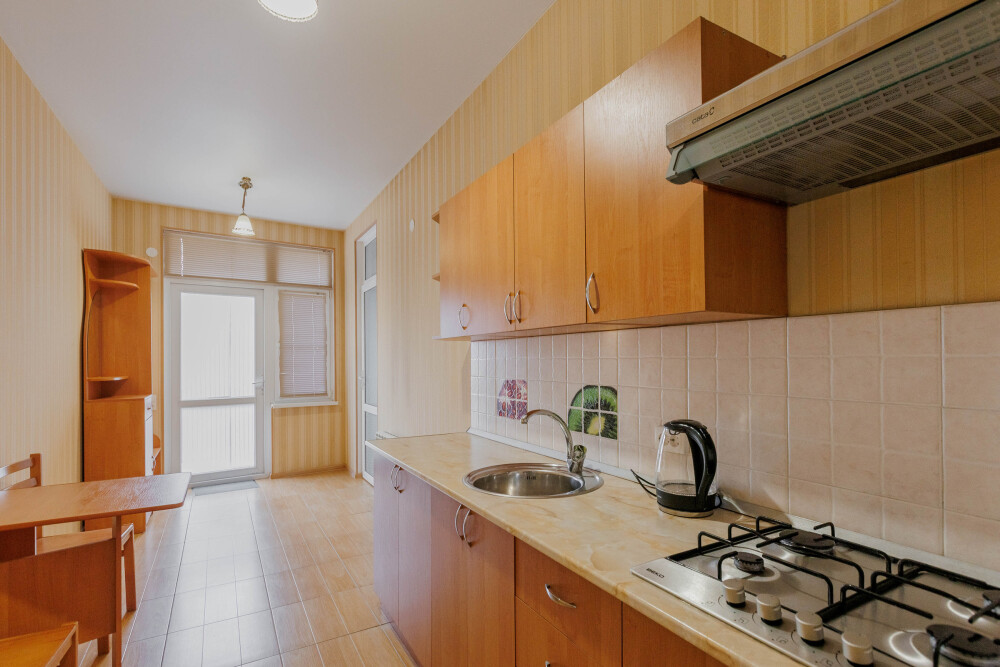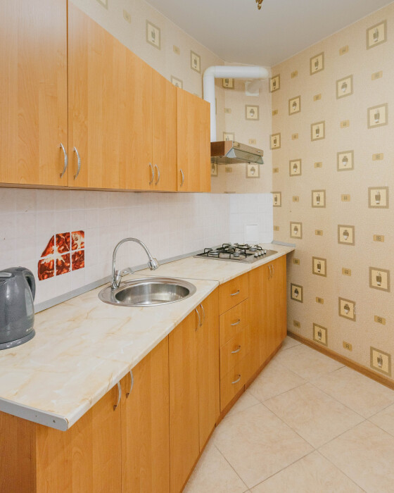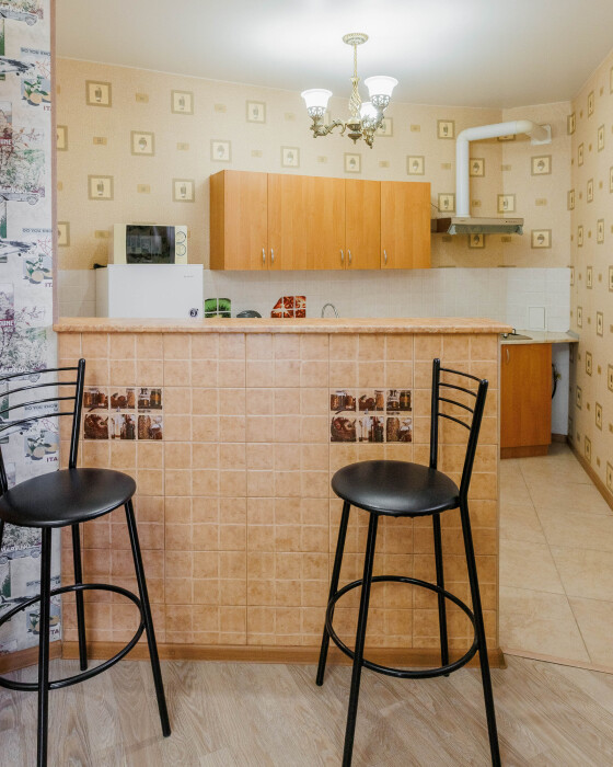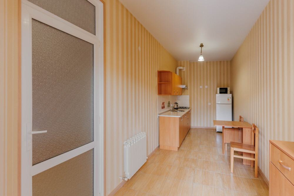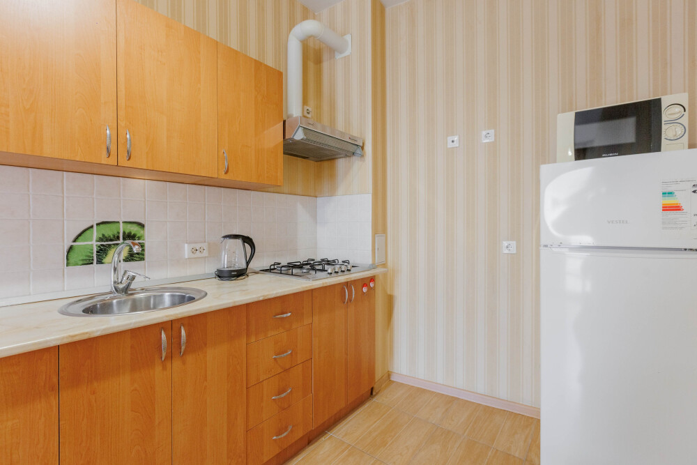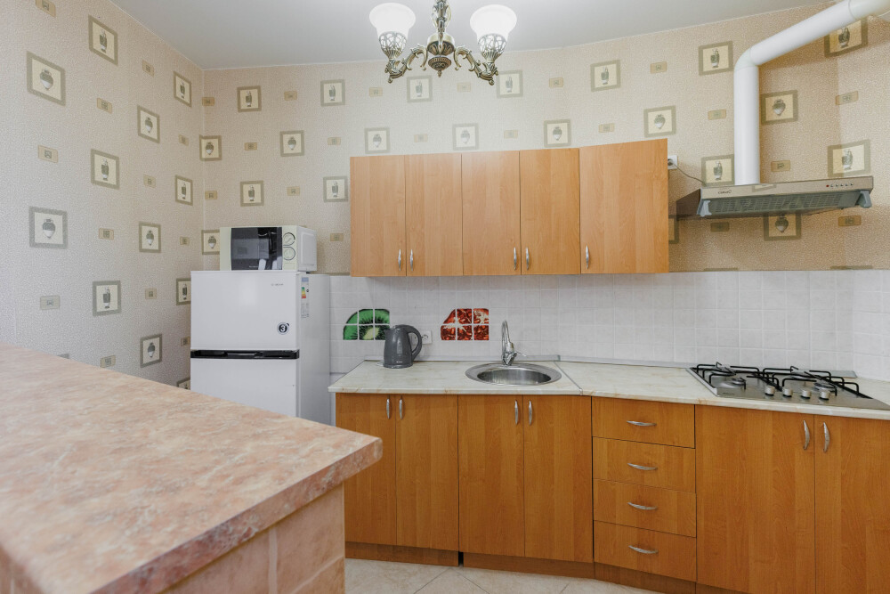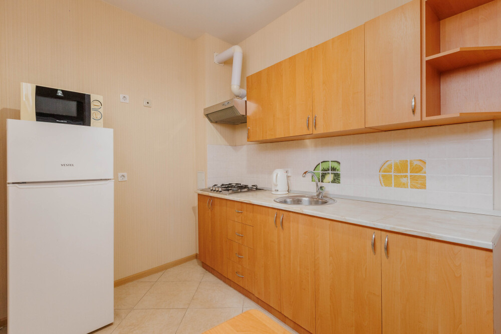 В номере есть кухонная зона с плитой, всей необходимой посудой и инвентарём.