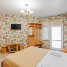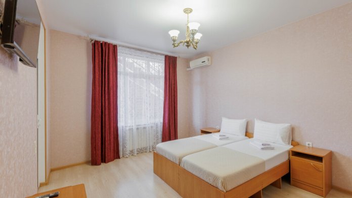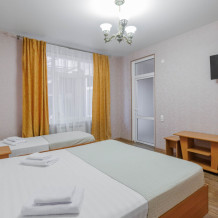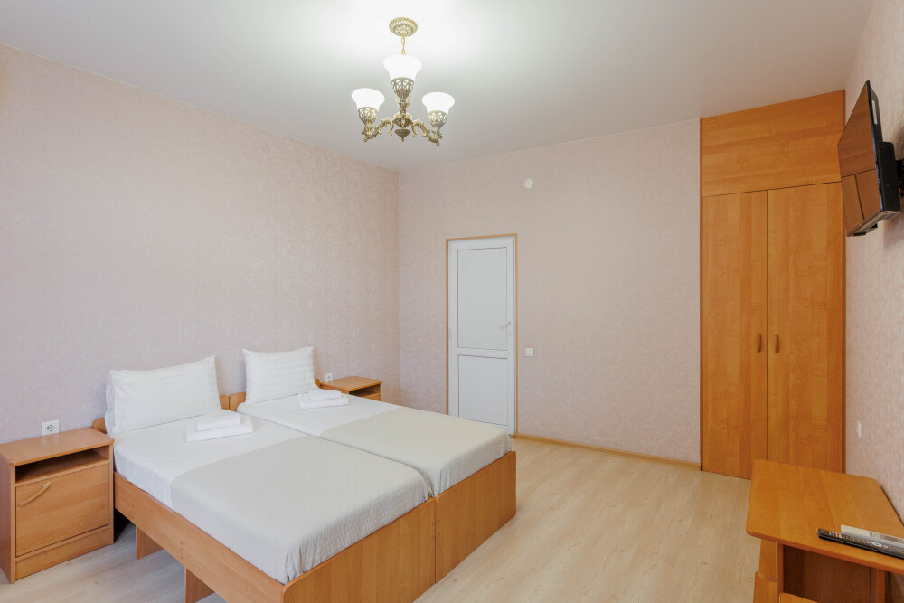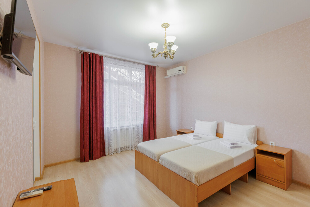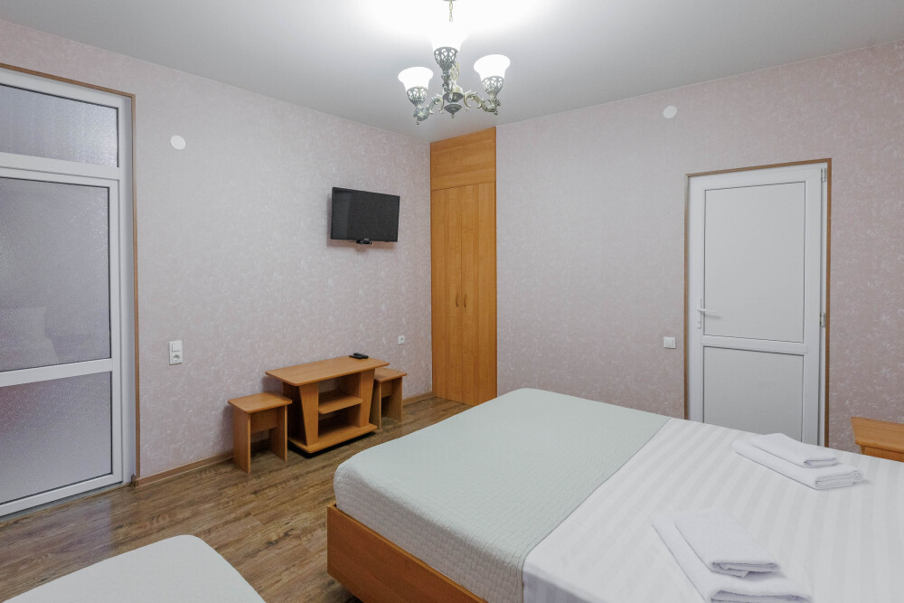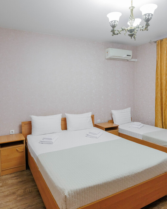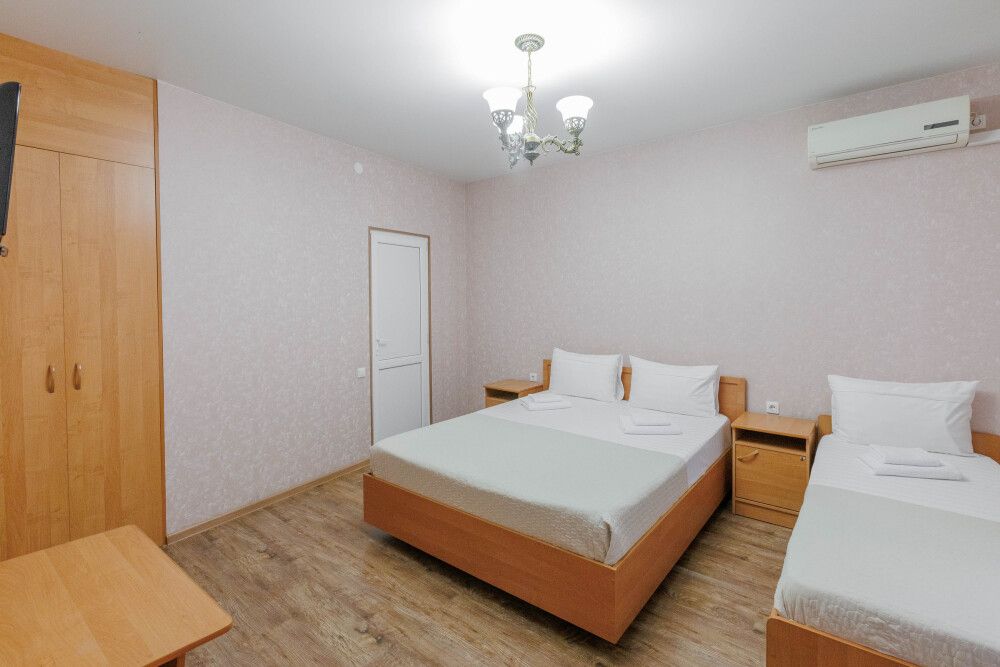 Мягкая двуспальная и односпальная кровати. Собственная кухонная зона, кондиционер, холодильник, ЖК телевизор и санузел с душем обеспечат ваше удобство. В номере есть журнальный столик и шкаф-купе.