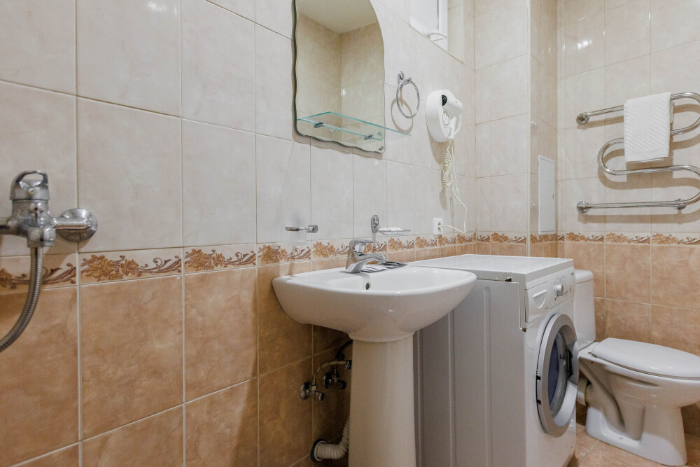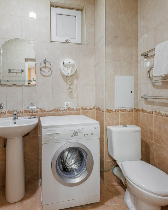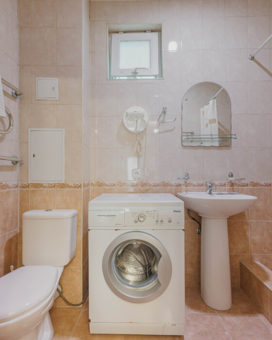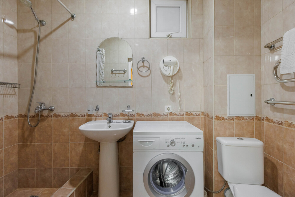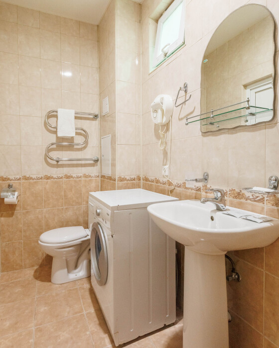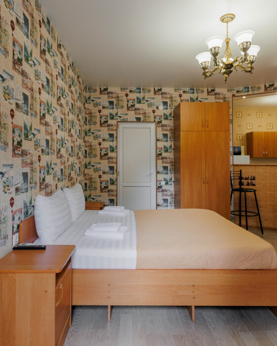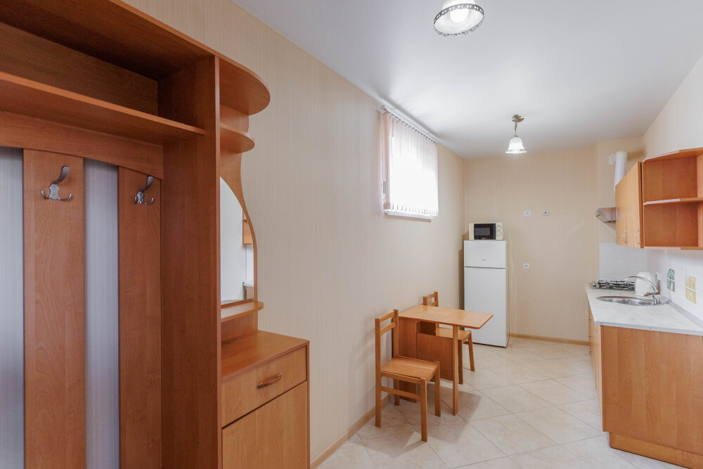 Мягкая двуспальная и односпальная кровати. Собственная кухонная зона, кондиционер, холодильник, ЖК телевизор и санузел с душем обеспечат ваше удобство. В номере есть журнальный столик и шкаф-купе.