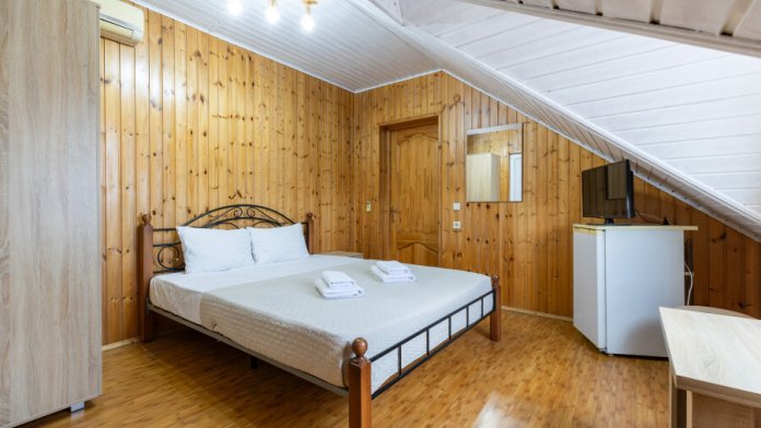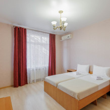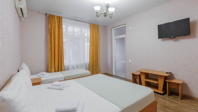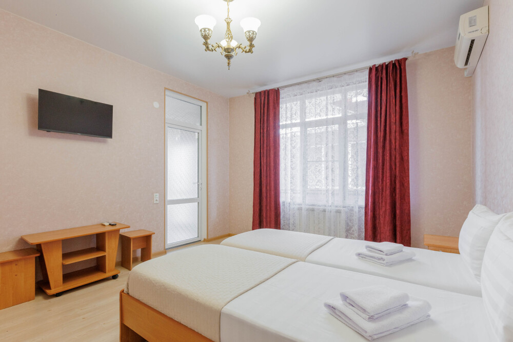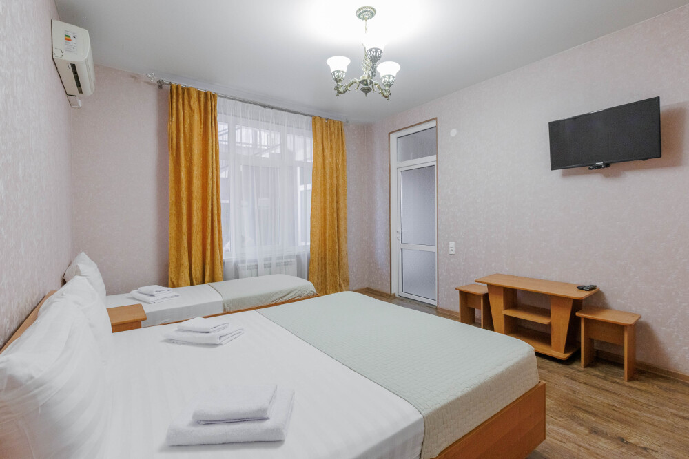 Удобные кровати, двуспальная и односпальная, качественное постельное бельё гарантируют вам полноценный отдых после прогулок, экскурсий и походов на пляж. Кондиционер создаст вам приятную прохладу в жаркие летние дни , холодильник, ЖК телевизор и собственный санузел с душем обеспечат ваше удобство.