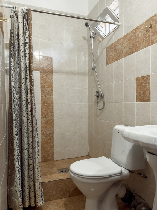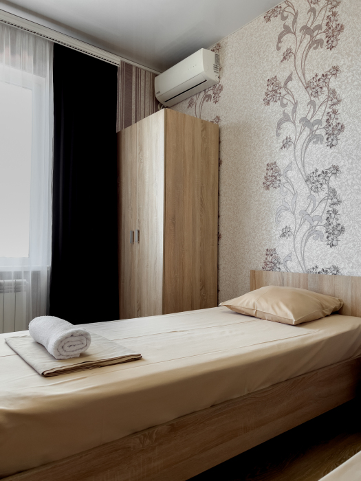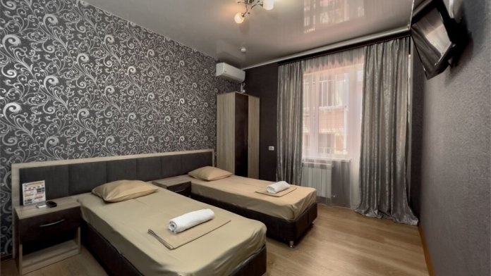 Номер оборудован всем необходимым для комфортного отдыха: собственная душевая комната, гигиенические принадлежности, шкаф, прикроватные тумбы, журнальный столик.