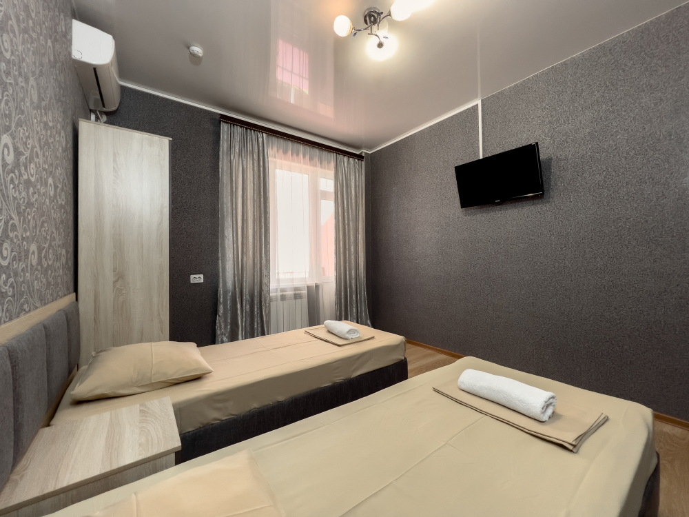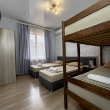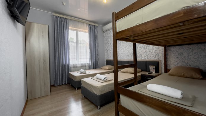 В номере две односпальные кровати и двухъярусная кровать, душ, туалет, телевизор, кондиционер, прикроватные тумбы, журнальный столик, шкаф. Балкона нет.