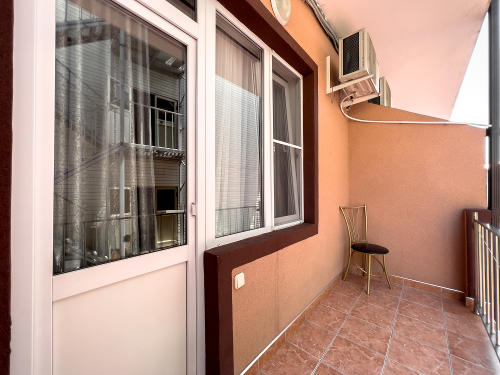 В номере две односпальные кровати, шкаф, прикроватные тумбы, журнальный столик, вентилятор, телевизор. Балкона нет