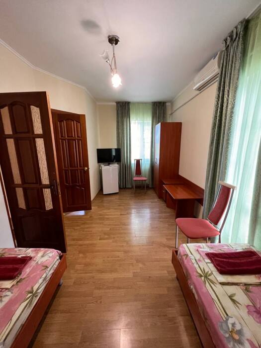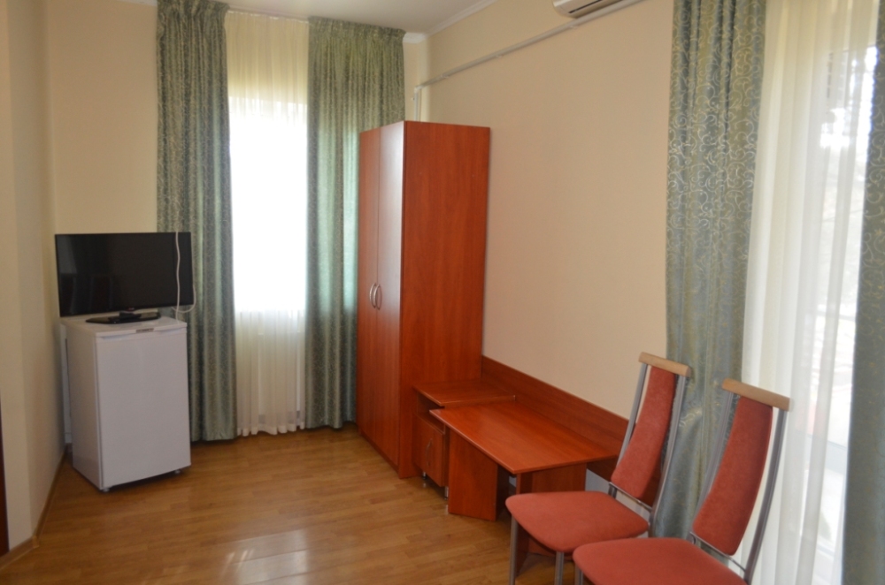 Во всех номерах односпальные (при желании сдвигаются) или двуспальная кровати , шкаф, стулья, кондиционер, прикроватные тумбочки, журнальный столик, стол, вешалка, зеркало, ЖК-телевизор с 20 каналами цифрового телевидения, холодильник.