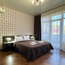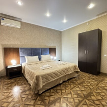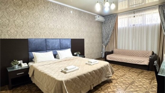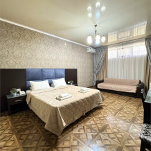 Просторный семейный номер расположен на цокольном этаже и вмещает до 4х человек. Состоит из комнаты и санузла (общая площадь 32 м2). Номер оснащен всеми удобствами для комфортного отдыха - двуспальной кроватью с ортопедическим матрасом, двуспальным диваном, тумбочками, шкафом для одежды, письменным столом, зеркалом, мини-холодильником, кондиционером, телевизором с плоским экраном, сейфом. Номер укомплектован постельным бельем, полотенцами, тапочками. В ванной комнате, укомплектованной феном и набором туалетно-косметических принадлежностей, установлен душ или ванна.