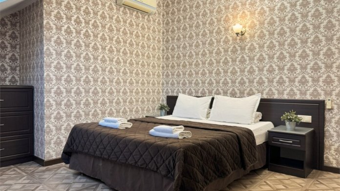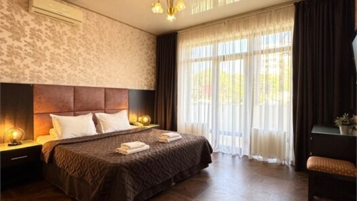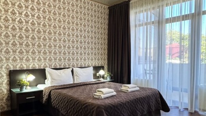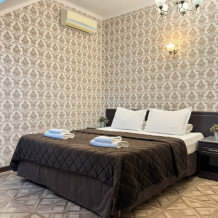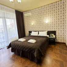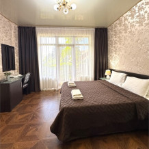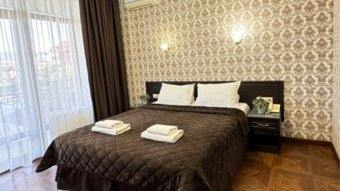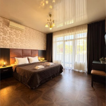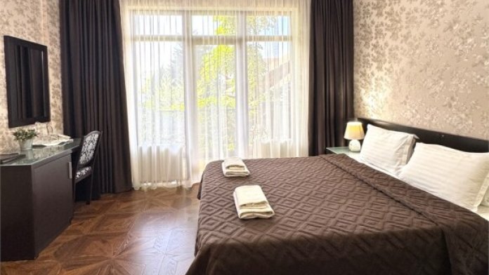 Номер расположен на 1 этаже отеля. Состоит из комнаты и санузла (общая площадь 24 м2). Номер оснащен всеми удобствами для комфортного отдыха - двуспальной кроватью (или двумя односпальными) с ортопедическими матрасами, раскладным креслом, тумбочками, шкафом для одежды, письменным столом, зеркалом, мини-холодильником, кондиционером, телевизором с плоским экраном, сейфом. Номер укомплектован постельным бельем, полотенцами, тапочками. В ванной комнате, укомплектованной феном и набором туалетно-косметических принадлежностей, установлен душ