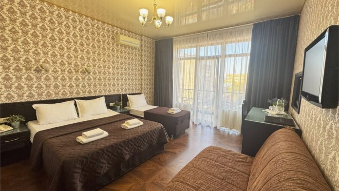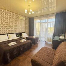Номер состоит из комнаты и санузла ( 25 м2), оснащен двуспальной , односпальной кроватями и раскладным диваном (ширина 1,2 м). В Номере установлены тумбочки, шкаф для одежды, письменный стол, зеркало, мини-холодильник, кондиционер, телевизор с плоским экраном, сейф. Номер укомплектован постельным бельем, полотенцами, тапочками. В ванной комнате, укомплектованной феном и набором туалетно-косметических принадлежностей, установлен душ или ванна. Номера данной категории расположены на 2 и 3 этажах. На верхние этажи можно подняться только по лестнице.