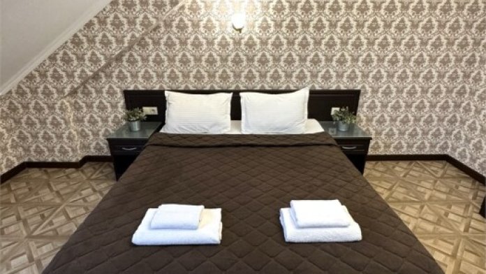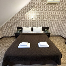 Номер состоит из комнаты и санузла, оснащен двуспальной кроватью (или 2 односпальными) с и раскладным диваном (ширина 1,2 м). В Номере установлены тумбочки, шкаф для одежды, письменный стол, зеркало, мини-холодильник, кондиционер, телевизор с плоским экраном, сейф. Номер укомплектован постельным бельем, полотенцами, тапочками. В ванной комнате, укомплектованной феном и набором туалетно-косметических принадлежностей, установлен душ. Номера данной категории расположены на 2 и 3 этажах. На верхние этажи можно подняться только по лестнице.