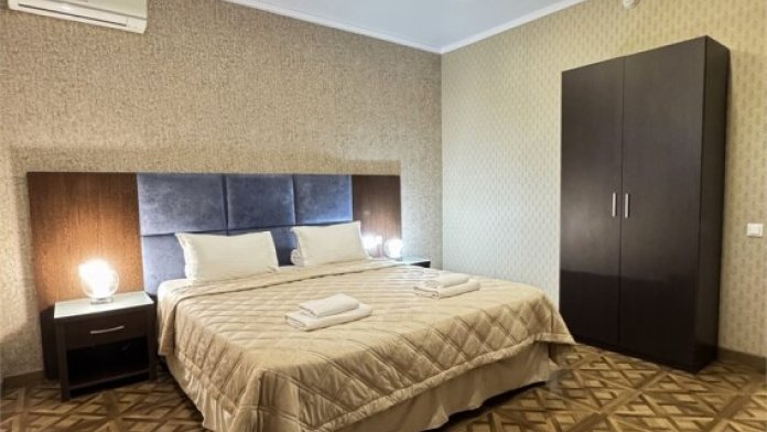 2х-комнатный семейный номер расположен на цокольном этаже и вмещает до 6-ти человек. Номер оснащен всеми удобствами для комфортного отдыха - двуспальной кроватью с ортопедическим матрасом, двумя односпальными кроватями, двуспальным диваном, тумбочками, шкафом для одежды, письменным столом, зеркалом, обеденной группой, мини-холодильником, кондиционером, телевизором с плоским экраном, сейфом. Номер укомплектован постельным бельем, полотенцами, тапочками. В ванной комнате, укомплектованной феном и набором туалетно-косметических принадлежностей, установлен душ.