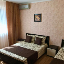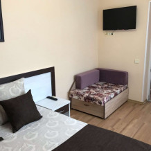 Представляет собой уютную комнату площадью около 16 кв.м. без балкона. В комнате: одна двуспальная кровать, одна односпальная кровать, диванчик, журнальный столик, 3стула, 3 прикроватные тумбочки, шкаф. Для комфортного отдыха есть сплит-система, телевизор-плазма с диагональю 80 см, 100 каналов, холодильник 2-камерный, электрочайник. Санузел на 2 комнаты, оборудованный душевой кабиной, раковиной, унитазом, зеркалом, вешалками. Возможно размещение 5 человек (3 основных места плюс 2 дополнительных) . Размещение ребенка без дополнительного места 200 руб. в сутки.