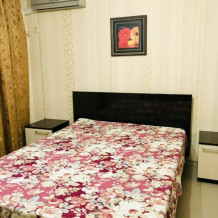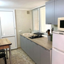 В квартире: двуспальная кровать, односпальная кровать, журнальный столик, стулья, шкаф. Для комфортного отдыха есть своя оборудованная кухня, микроволновая печь, газовая плита, сплит-система, телевизор- плазма, диагональ 80 см, 100 каналов, холодильник 2-камерный, электрочайник. Санузел оборудован душевой кабиной, раковиной, унитазом, зеркалом, вешалками. На 2 этаже квартира такая же, только она с 2 балконами и площадь около 25 кв.м. Размещение ребенка без дополнительного места 200 руб. в сутки.