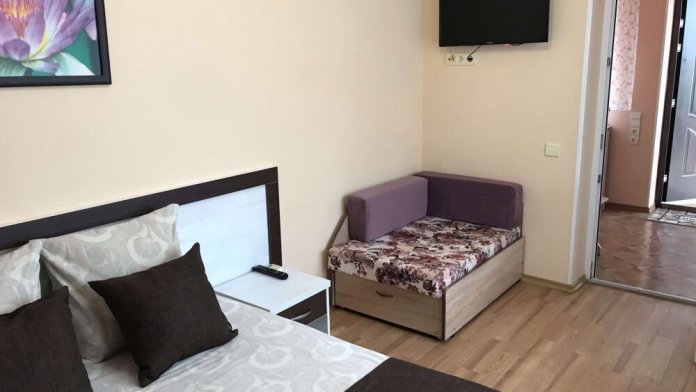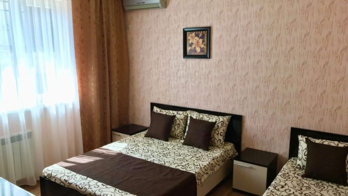 Комнаты есть с балконами и без. В комнате: одна двуспальная кровать, одна односпальная кровать, раскладной диван, журнальный столик, стулья, прикроватные тумбочки, шкаф. Для комфортного отдыха есть сплит-система, телевизор-плазма с диагональю 80 см, 100 каналов, холодильник 2х камерный, электрочайник. Санузел оборудован душевой кабиной, раковиной, унитазом, зеркалом, вешалками.