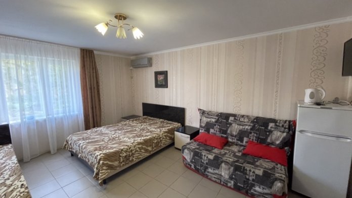 Комнаты есть с балконами и без. В комнате: одна двуспальная кровать, журнальный столик, 2стула, 2 прикроватные тумбочки, шкаф. Для комфортного отдыха есть сплит-система, телевизор-плазма с диагональю 80 см, 100 каналов, холодильник 2-камерный, электрочайник. Санузел оборудован душевой кабиной, раковиной, унитазом, зеркалом, вешалками. По Вашему желанию в комнате может быть установлено дополнительное место - раскладная кровать .Размещение ребенка без дополнительного места 200 руб. в сутки.