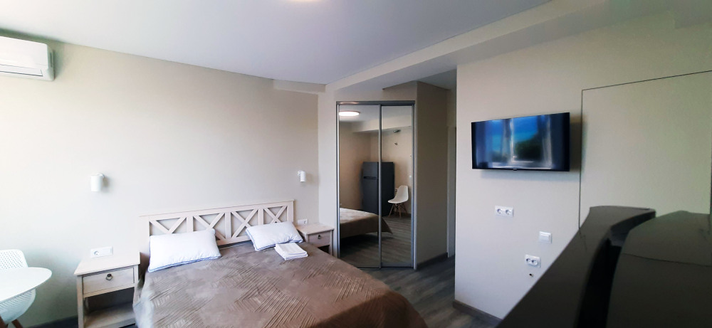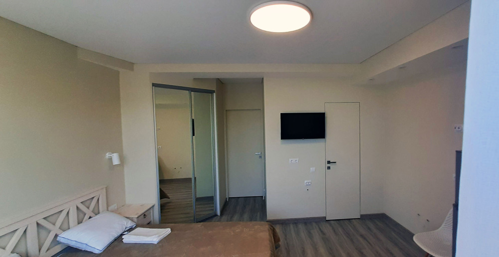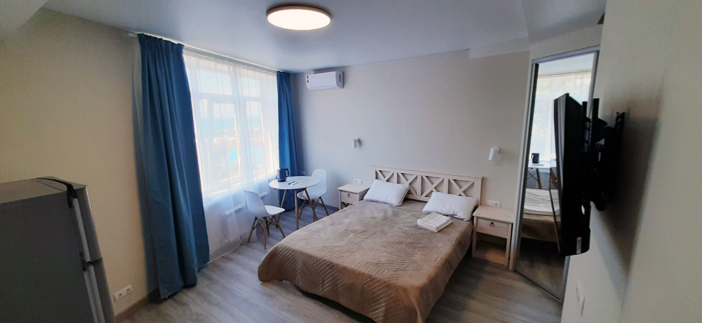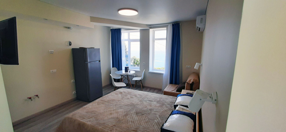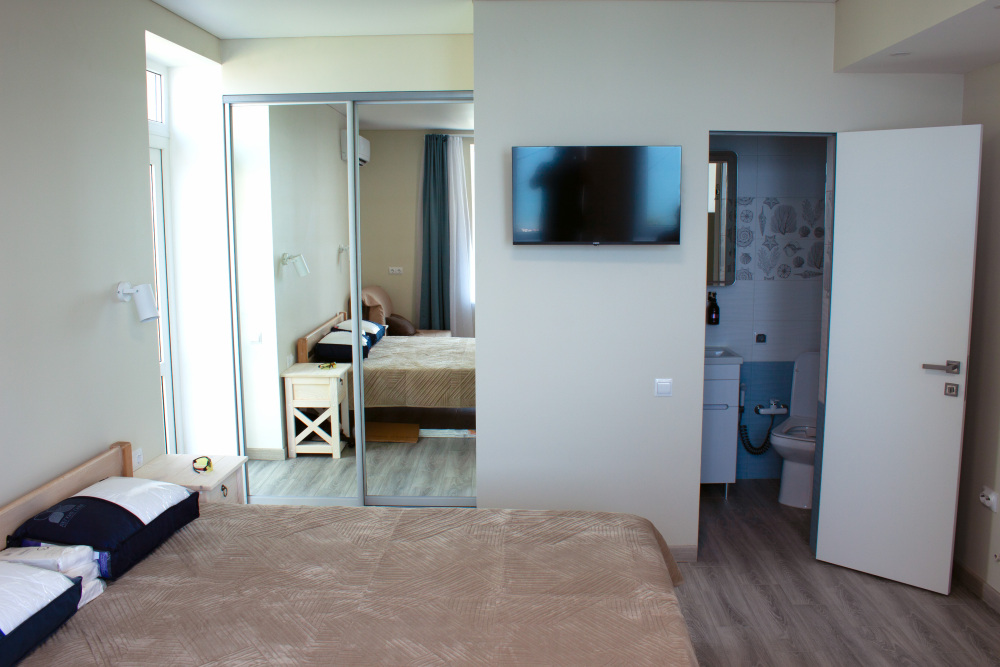В номере две комнаты, каждая с выходом на собственный панорамный балкон, где можно наслаждаться вечерним закатом и звездным небом. Бесплатный Wi-Fi, санузел с душевой кабиной, горячая вода и свежие полотенца. Двуспальная кровать 140 на 200, во второй комнате кровать 160 на 200 и односпальная кровать 70 на 200. Телевизор в каждой комнате, мощный кондиционер и холодильник для прохладительных напитков. Электрический чайник для утреннего кофе и всё то, что создает ощущение домашнего уюта. Выходите на общую просторную веранду с бассейном, который уже с июня прогревается до комфортных +25°C.