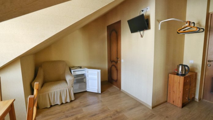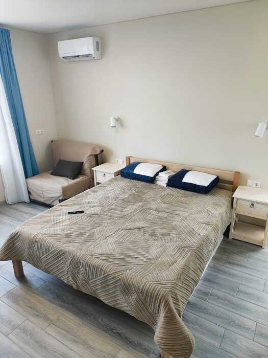 В номере бесплатный Wi-Fi, санузел с душевой кабиной, горячая вода и свежие полотенца. Двуспальная кровать 160 на 200, односпальная кровать 70 на 200 и раскладное кресло. Телевизор для развлечений, мощный кондиционер для идеального микроклимата и холодильник для прохладительных напитков и фруктов. Электрический чайник для утреннего кофе и всё то, что создает ощущение домашнего уюта.