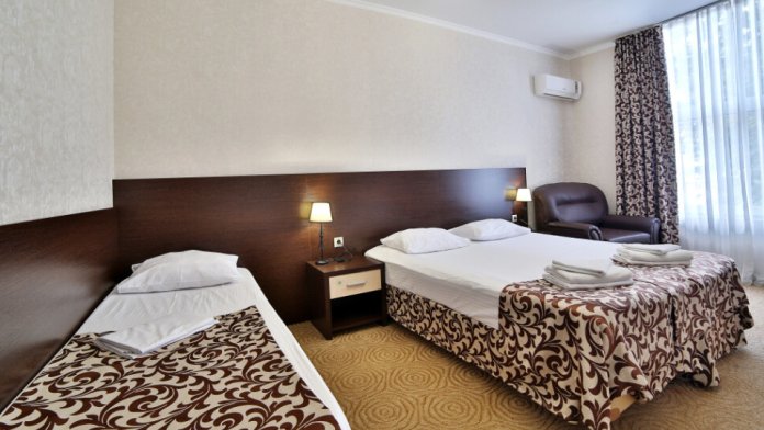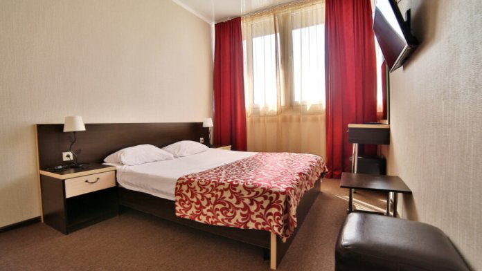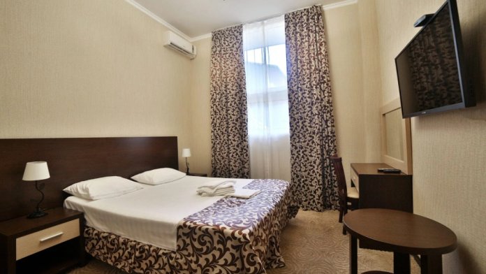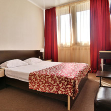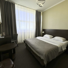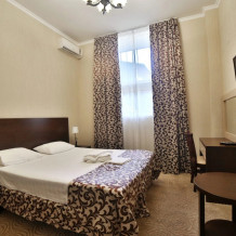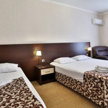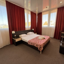 Большой просторный номер, есть возможность разместиться небольшой семьей. В номере большая двухспальная кровать, дополнительно односпальная кровать. Полностью укомплектован (сплит-система, телевизор, холодильник, шкаф.) В номере есть ванная и туалет.