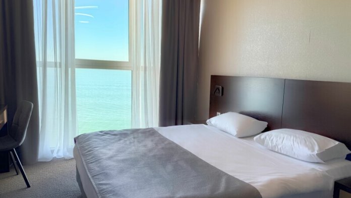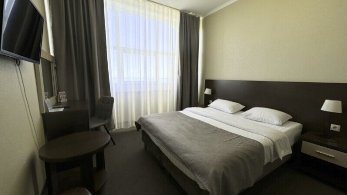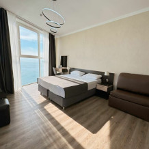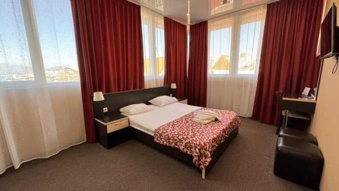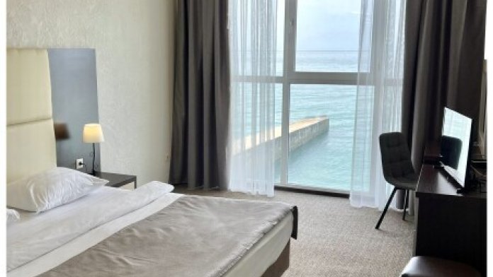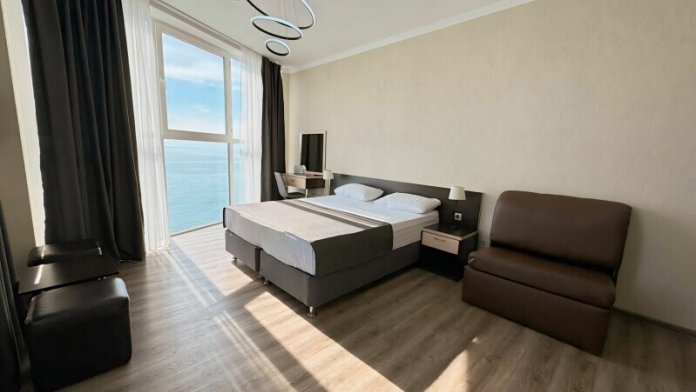 Просторный номер с панорамным видом на море. Не выходя из номера Вы сможете встретить рассвет и закат, насладиться шумом моря. В номере большая двухспальная кровать, ванная комната, полностью укомплектован для комфортного проживания. Возможно размещение третьего гостя за дополнительную плату (кресло-кровать).